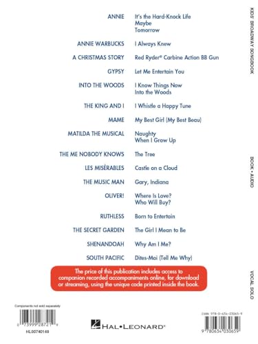 (Vocal Collection). This landmark collection of music originally sung onstage by children was released in 1993, and has become the most used collection of theatre music for kids. Now this same collection is available with a much needed companion online audio of piano accompaniments. Child singers can practice with the recording as many times as they like … until they drive Mom and Dad crazy! Includes: Castle on a Cloud * Gary, Indiana * I Whistle a Happy Tune * It’s the Hard-Knock Life * Let Me Entertain You * Tomorrow * Where Is Love? * and more! Audio is accessed online using the unique code inside the book and can be streamed or downloaded. The audio files include PLAYBACK+, a multi-functional audio player that allows you to slow down audio without changing pitch, set loop points, change keys, and pan left or right.