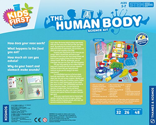 Learn about the human body by doing experiments with your five senses that show you how your body works. By exploring the external aspects of your body with hands-on experiments, you can learn a lot about the inside anatomy of the body. Examine your fingerprints to learn how you are unique. Build a stethoscope and listen to your heartbeat to learn how your heart pumps blood, and listen to your gurgling tummy to learn how your stomach works. With the stethoscope, you can investigate how your ears hear with a listening game and a sound memory experiment. Test your lung capacity to learn about how your lungs work. Examine your diet and your digestive functions to learn how your body processes nutrients to give you the energy to do more experiments! Try a blindfolded exercise to find out about hand-eye coordination. Take a tickle test to learn about your skin and sensory receptors. Monitor your pulse to learn about your circulatory system. Follow your nose in a smell memory game to learn about your sense of smell. Take a blindfolded taste test to learn about your tongue. Try some balancing exercises to explore your muscles and bones. Discover how your ears play a role in your balance. Construct a magic telescope, spin an optical illusion top, and hold a staring contest to see how your eyes work. Relate your experiments back to human body systems, including the internal organs, skeleton, muscles, and the circulatory system, with clear and accurate anatomical illustrations. With a 48-page, full-color illustrated guidebook, this kit teaches human biology fundamentals with step-by-step, hands-on experiments.