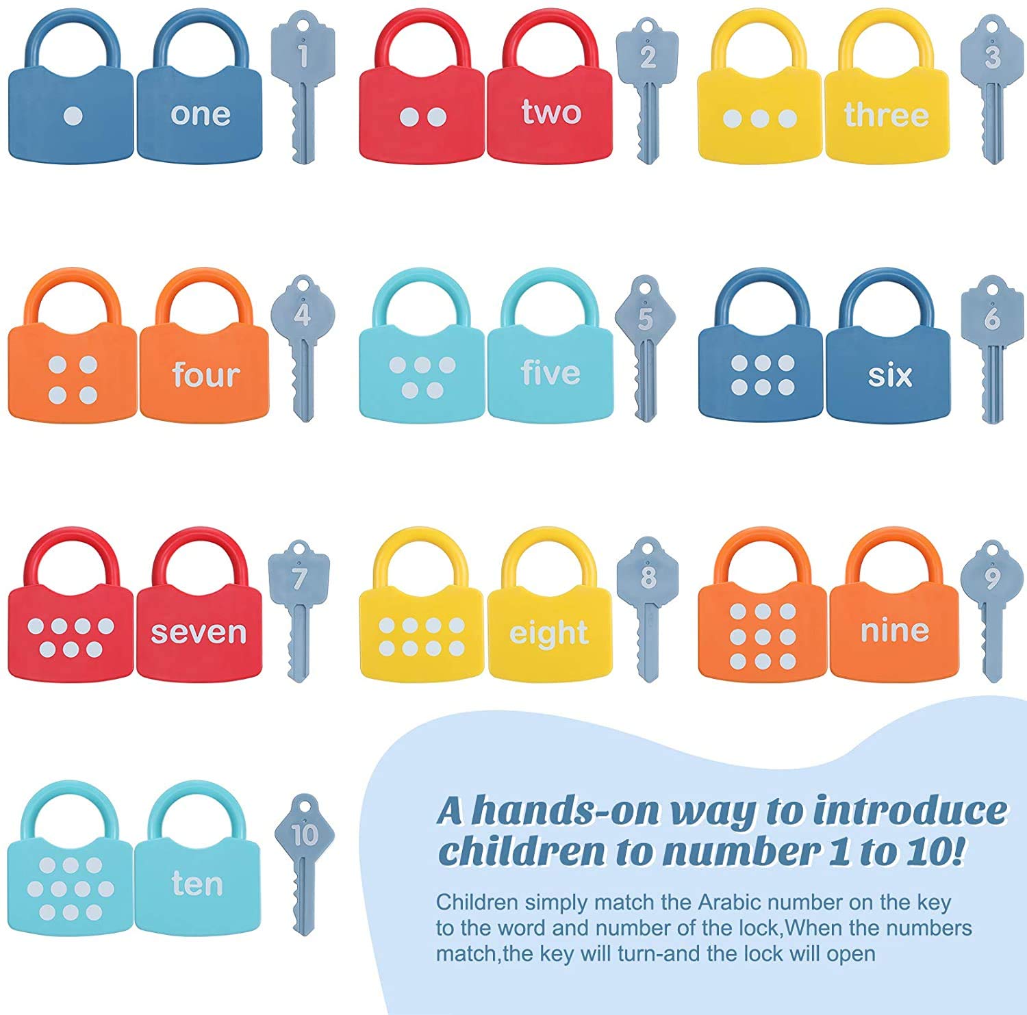 Kids Learning Locks, Numbers Sorting Matching Locks, Children can start a lock-opening game at any time. Whoever can open the lock quickly will win. Children like to imitate adults to open the locks. We designed child sized lightweight lock with colorful looks. The beautiful pattern can attract tots to open them, have fun of unlocking, learning counting and number matching. Unlocking games can effectively inspire people’s thinking, train their thinking, judgment and patience Package Includes: A set includes 10 numbered locks with 10 keys. The locks correspond to the keys one by one, with dots on one side equal to the numbers on the other. Product Size: Keys Size: 7. 3 x 3 cm/ 2. 9 x 1. 2 inches Locks Size: 8 x 6. 5 x 2. 7 cm/ 3. 2 x 2. 5 x 1. 1 inches Safe Material The digital locks and keys are made of non-toxic PP materials and without sharp burrs. And they are brightly color, which can attract children’s attention and get them to put down their phones and immerse themselves in the game. Develop Basic Skills The digital locks are improves observation, logical thinking, hands-on ability, hand-eye coordination and fine motor skills, problem solving, shape recognition, memory, and task completion. And enhances mathematics and counting skills. New Digital Learning Toy Unlike traditional number learning toys, this digits lock toy allows your child to successfully unlock the locks by finding matching keys, completing the knowledge and learning of numbers in a whole new way. Security Tool Besides being a fun toy, these delightful locks can also be used as security tools for children’s personal belongings.