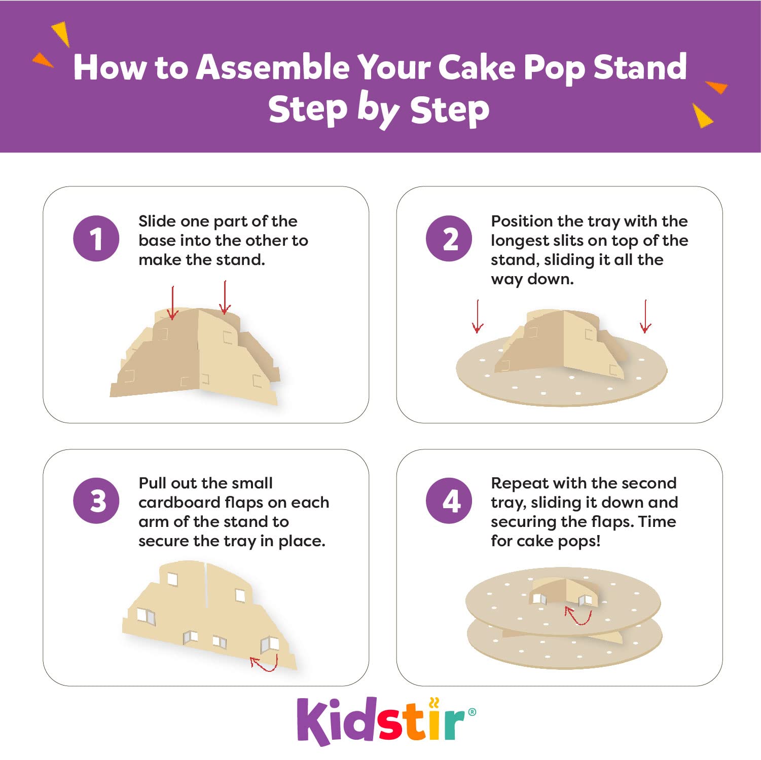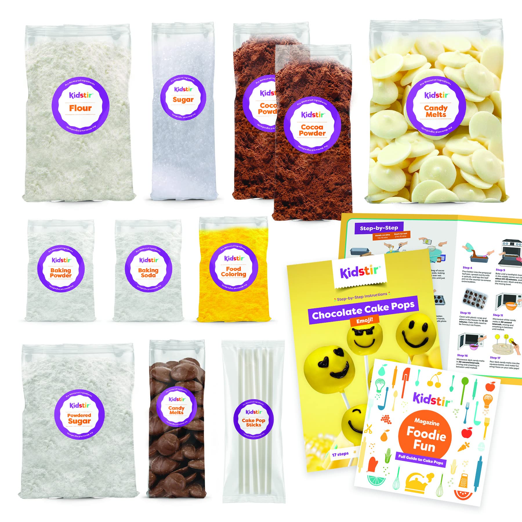 - PACKED WITH FUN: Bite into tons of fun! Pre-measured ingredients, cake pop sticks, and candy decorations and a BONUS Cake Pop display stand holder included. Kidstir cake pop decorating kit makes 12-15 delicious cake pops. Six-page illustrated booklet with expert baking tips, and step-by-step recipe instructions.
