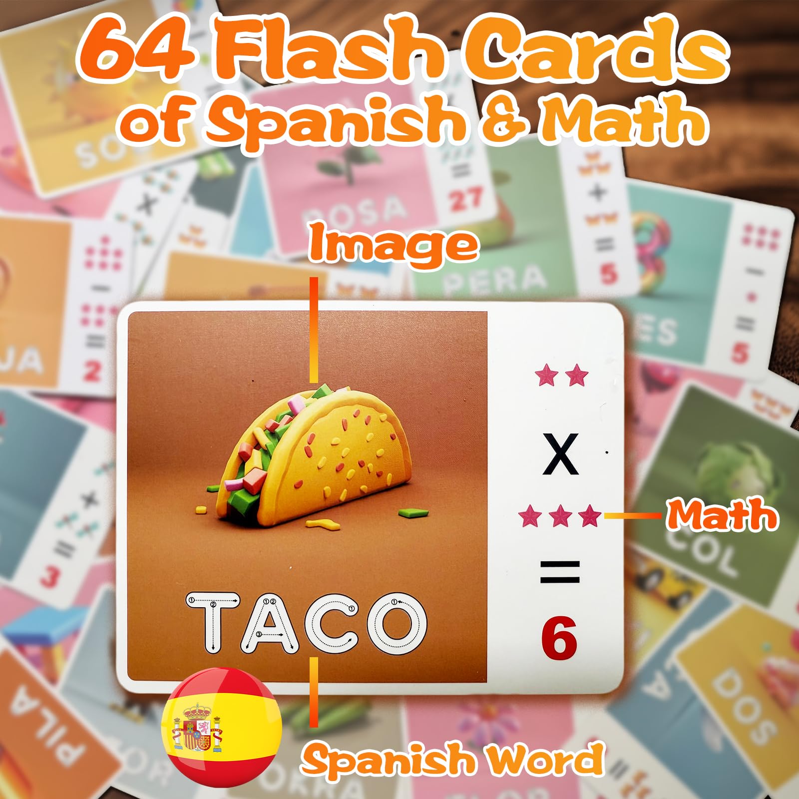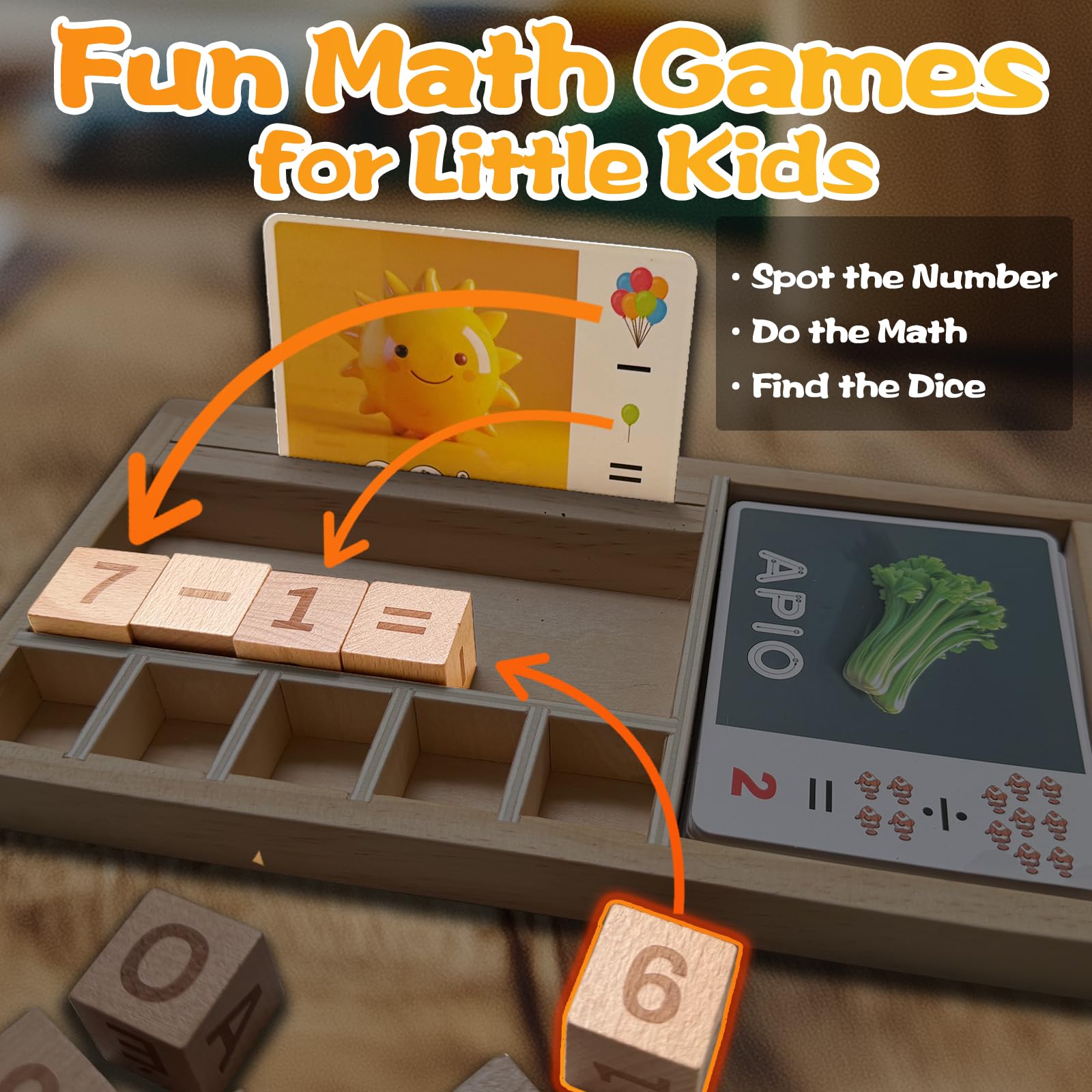 • COMPLETE SET WITH TRAY, FLASH CARDS & DICE: Includes 1 wooden puzzle tray, 32 double-sided flash cards with pictures, Spanish sight words, and math problems, plus 12 dice printed with letters, numbers, and math symbols–ideal for abc learning toys for kids ages 3-5.