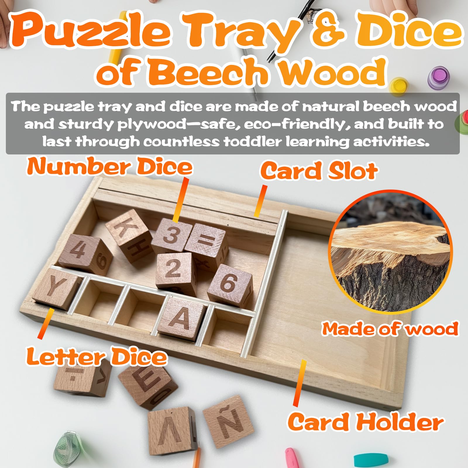 • SAFE & DURABLE BEECH WOOD DESIGN: Unlike plastic alternatives, our puzzle tray and dice are made of natural beech wood and sturdy plywood–safe, eco-friendly, and built to last through countless toddler learning activities.