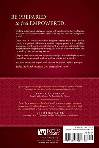 Become the Kingdom Woman God Is Calling You to Be Women, lean in: You grace this world with insight, sensitivity, wisdom, and spiritual beauty that has made you a force behind great accomplishments. Much of what comes in the life of a kingdom woman may not make headlines, but when you become passionate about what God is passionate about, positive change can occur in lives, families, communities, and even our nation. Your solution to the burdens of this life is found in humbling yourself before Jesus Christ and surrendering to the Word of God. Together with his daughter, Crystal Evans Hurst, Dr. Tony Evans shows you what it means to live as a biblical woman and embrace your femininity, to walk by faith (not just talk about it), to make decisions in alignment with God, to raise up the next generation, and to discover that tremendous freedom comes when your ultimate submission is under a caring and loving God. How do you do this? Kingdom Woman serves as a practical and empowering path to help you along the journey of life as you learn to: Let go of hopelessness and disappointment to fully experience your destiny Value what God values–humility, meekness, and the beauty of a servant’s heart Confidently follow God on the pathway of faith, even if you can’t see the destination Choose to have faith to believe that the dark road you are traveling on will eventually yield to a sunrise Pursue God and His Word in a way that your actions follow His instructions Exercise authority through prayer for heavenly intervention in your earthly affairs God is writing your story. Live like the Christian woman He designed you to be.