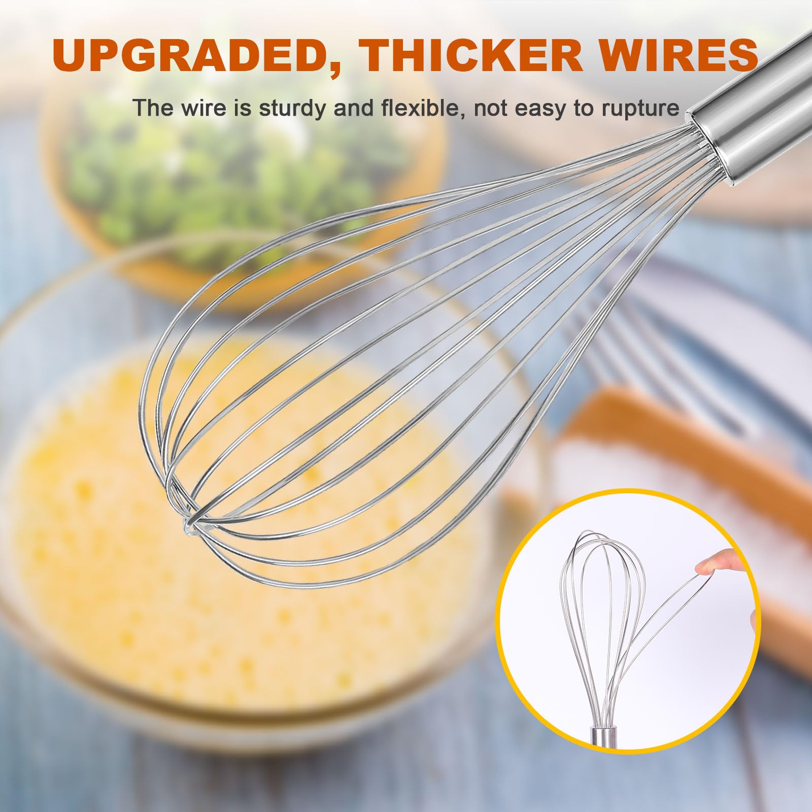 UPGRADED THICKER WIRES:The upgraded, thicker wires provide enhanced strength, making the whisk highly resistant to wear and tear. It’s exceptionally durable and perfect for tasks like mixing, beating, whisking, and stirring.