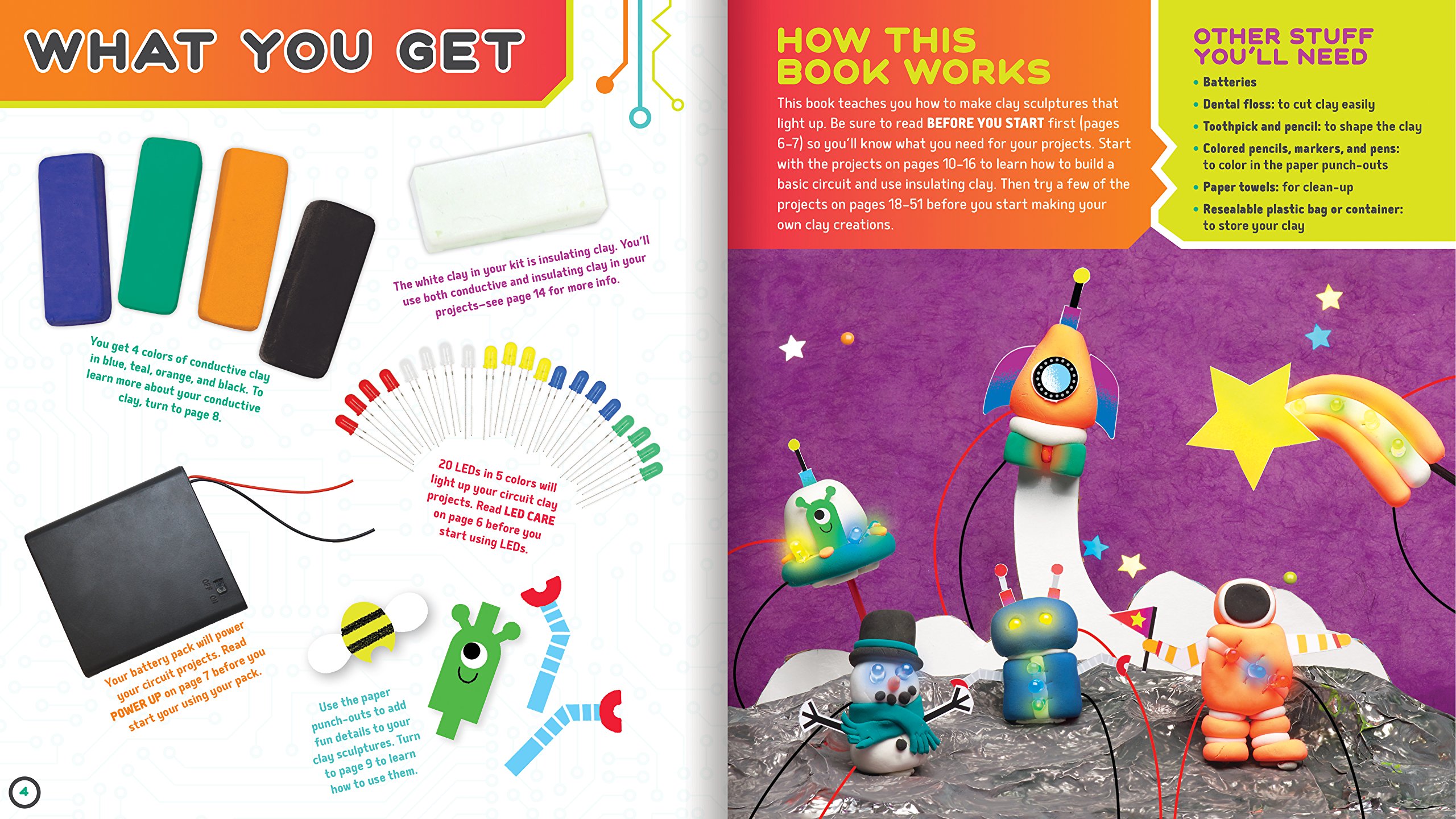 Learning electricity is easy when you make clay creations that glow! Use our special conductive and insulating clay to make a sculpture, add LEDs, attach a battery pack, and watch your clay circuit light up. With more than 15 projects to choose from, including a robot, a UFO, a Dragon, and much more, circuit clay will surely spark your interest with a positive charge of creativity!