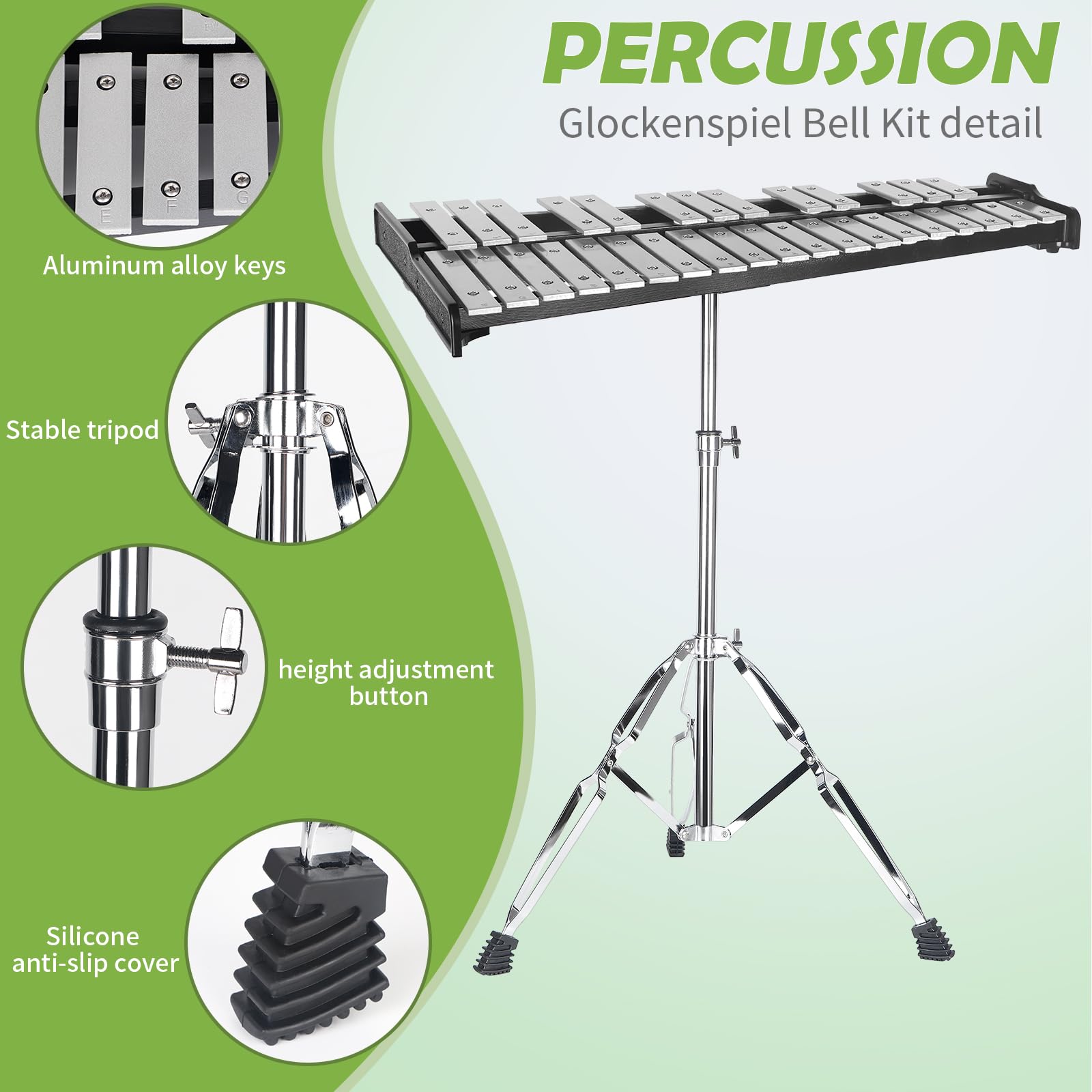 Kmise 32 Note Glockenspiel Xylophone Bell Kit: Professional Xylophone for Adult with Carry Bag, 8” Practice Pad,3 Sets Drum Stick Percussion Kit
