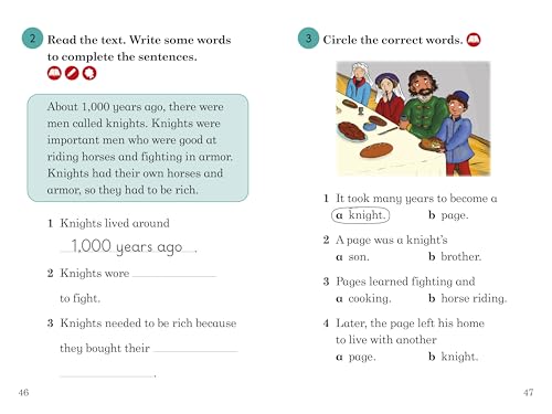 Ladybird Readers is an ELT graded reader series for children learning English as a foreign or second language. The series includes traditional tales, favourite characters, modern stories and non-fiction – featuring Spot, Peppa Pig and Peter Rabbit and classic authors such as Roald Dahl. Recommended for children aged 3-11, the eight levels of Ladybird Readers follow the CEFR framework(Pre-A1 to A2+) and include extra learning activities that develop key skills and provide preparation for the Cambridge English tests. Each book is Lexile measured and introduces key vocabulary and character names at the start of each reader. The books are written by language learning experts and include access to online audio, supplementary activities and learning resources including role plays, phrase cards and lesson plans. This Level 4 Reader is A2 in the CEFR framework and includes practice for the Cambridge English A2 Flyers tests. The longer text is made up of sentences with up to three clauses, more past and future tense structures, modal verbs and a wider variety of conjunctions. About 1,000 years ago, there were men called knights. They lived in castles. It took many years to become a knight!