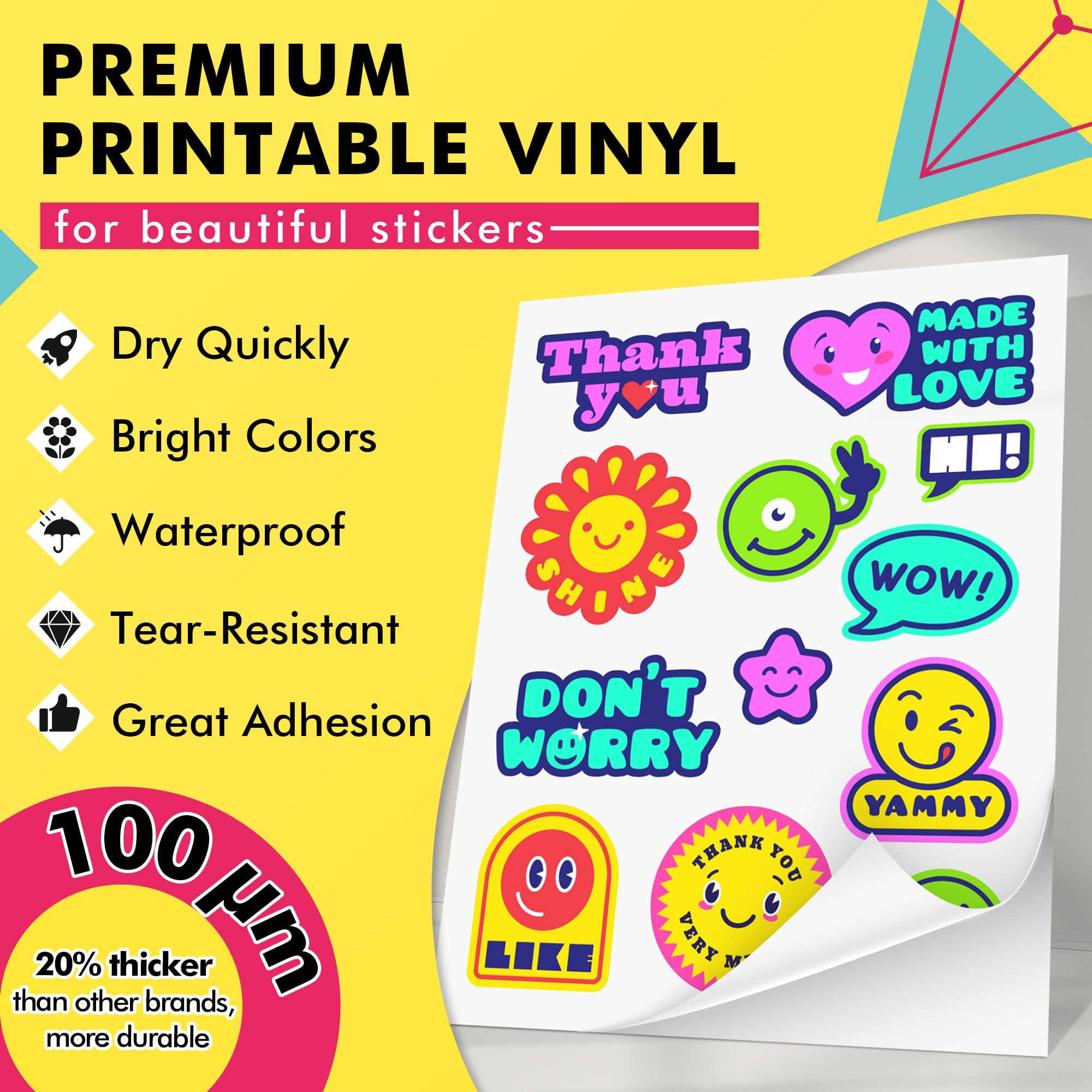 • Durable & Water-Resistant: Crafted from premium vinyl material, our sticker paper is water-resistant and ensures durability in various conditions. For full waterproofness and extended lifespan, apply laminate sheets or a sealer spray after printing.