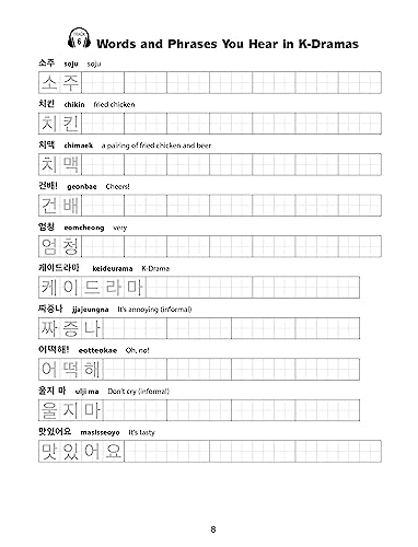 Learn to Write and Read the Korean Hangul Alphabet with K-Pop and K-Drama Words and Phrases! This comprehensive workbook is designed to teach beginners how to write and read the Korean Hangul script. It features a complete introduction to the Hangul letters and syllable combinations, with reference charts and guided writing exercises that show you the correct way to write each letter and how to combine them to form words. This all-in-one learning tool includes 14 pages of writing practice exercises for words commonly found in K-Pop songs and K-Drama shows, and over 100 pages of blank writing grids for handwriting practice with lined pages for note-taking. Free online audio recordings by native Korean speakers teach you the correct sounds and pronunciations of all the letters and words in the book.