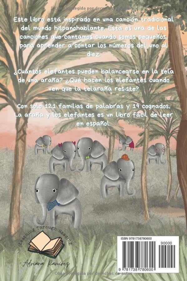 Are you learning Spanish? You can read this book on your own!! Reading is an amazing way to acquire a new language. Learn Spanish through reading! What does this book give you? Helps you expand your vocabulary in Spanish. Controlled language at your level from the most frequent words to help you progress confidently. Provides you with lots of exposure to the most common verbs in Spanish in present tense. Rewarding long story for beginners written with only 121 word families and 19 cognates. A complete bilingual word list of all the words used in the story provided at the end of the book. Beautiful illustrations that enhance comprehension. What is the story about? Este libro esta inspirado en una cancion tradicional del mundo hispanohablante. Esta es una de las canciones que cantamos cuando somos pequenos, para aprender a contar los numeros del uno al diez. ?Cuantos elefantes pueden balancearse en la tela de una arana? ?Que hacen los elefantes cuando ven que la telarana resiste? Con 121 familias de palabras mas 19 cognados, La arana y los elefantes es un libro facil de leer en espanol.