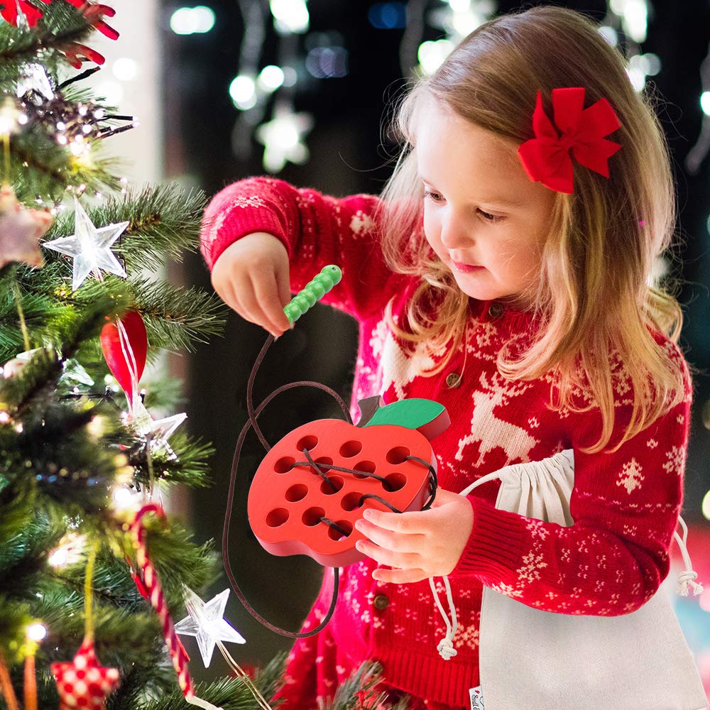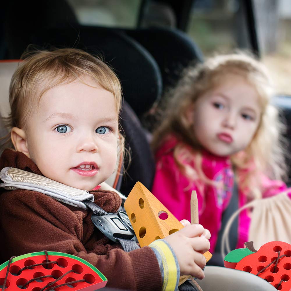 - WOOD PUZZLE STRING AND BLOCKS FOR BOYS AND GIRLS -You and your kids will absolutely love these fun lace up and threading toy set that includes 1 apple slice with caterpillar, 1 watermelon slice with worm, and 1 cheese wedge and mouse.They have different choices of toys which they can play by themselves or share with their friends.Moms and dads will also appreciate the storage bag that comes with the package for better storage.We also added an additional fruit sticker sheet with mini fruits.