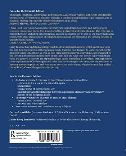 Offering a more accessible alternative to casebooks and historical commentaries, Law Among Nations explains issues of international law by tracing the field’s development and stressing key principles, processes, and landmark cases. This comprehensive text eliminates the need for multiple books by combining discussions of theory and state practice with excerpts from landmark cases. The book has been updated in light of the continuing revolution in communication technology, the dense web of linkages between countries that involve individuals and bodies both formal and informal; and covers important and controversial areas such as human rights, the environment, and issues associated with the use of force. Renowned for its rigorous approach and clear explanations, Law Among Nations remains the gold standard for undergraduate introductions to international law. New to the Eleventh Edition Added or expanded coverage of timely issues in international law: Drones and their use in the air and in space Immigration Islamic views of international law Inviolability and the difference between diplomatic immunity and sovereignty, in light of the Benghazi attack Thoroughly rewritten chapters in areas of great change: International criminal law Just war and war crime law New cases, statutes, and treaties on many subjects