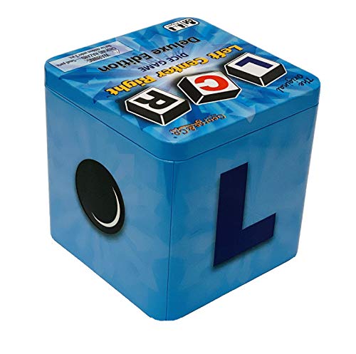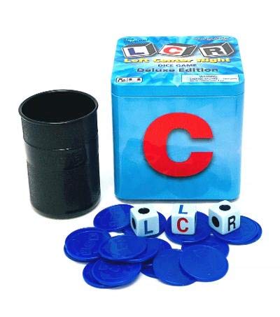 LCR Left Center Right Deluxe Edition game. Our Deluxe Edition game includes three specialty marked deluxe sized LCR Dice, 24 large playing chips, a dice cup, instructions and can easily be stored in the custom designed dice cube tin. Players roll the dice to determine where they pass their chips. The last player with chips is the winner and wins the center pot!