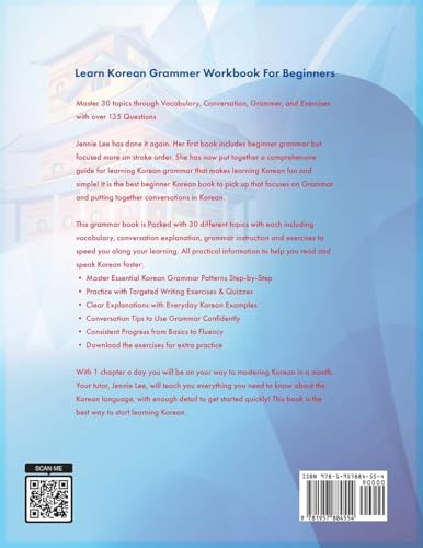 Learn Korean Grammer Workbook For Beginners Master 30 topics through Vocabulary, Conversation, Grammer, and Exercises with over 135 Questions Jennie Lee has done it again. Her first book includes beginner grammar but focused more on stroke order. She has now put together a comprehensive guide for learning Korean grammar that makes learning Korean fun and simple! It is the best beginner Korean book to pick up that focuses on Grammar and putting together conversations in Korean. This grammar book is Packed with 30 different topics with each including vocabulary, conversation explanation, grammar instruction and exercises to speed you along your learning. All practical information to help you read and speak Korean faster: Master Essential Korean Grammar Patterns Step-by-Step Practice with Targeted Writing Exercises & Quizzes Clear Explanations with Everyday Korean Examples Conversation Tips to Use Grammar Confidently Consistent Progress from Basics to Fluency Download the exercises for extra practice With 1 chapter a day you will be on your way to mastering Korean in a month. Your tutor, Jennie Lee, will teach you everything you need to know about the Korean language, with enough detail to get started quickly! This book is the best way to start learning Korean. Click ‘Add to Cart’ and begin or continue your Korean language journey now!