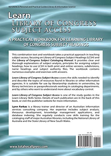 A Practical Workbook for Learning Library of Congress Subject Headings Learn Library of Congress subject access covers the skills necessary for a subject cataloger in a library or information agency, whether at a professional or a paraprofessional level. It is suitable for use by librarianship students, and for those studying subject cataloging by themselves as part of their continuing professional development. Since most catalogs provide some subject access, it is important for all library students and most library staff to be familiar with at least the basics of subject cataloging. This book introduces students to the concepts of subject analysis and subject description. It provides practical guidance on identifying important topics and allocating appropriate terms to describe them. Since Library of Congress subject headings (LCSH) is the most widely used subject headings list worldwide, the main focus of the book is on effectively using this scheme. A mastery of Library of Congress subject headings will assist catalogers using any subject headings scheme. This first international edition of Learn Library of Congress subject access builds on previous Australian and North American editions, with a broader range of exercises and more information on chronological, geographic and name headings. A new chapter explains the features of Library of Congress’ online product, Classification Web, and how it can be used for efficiently searching LCSH. Throughout the text there are exercises to practise and test new skills, with answers for self-checking at the back of the book. You may not always agree completely with the answers given, and it is useful to check them with a teacher or experienced cataloger. Always bear in mind that there is often room for more than one interpretation or emphasis, particularly in the area of subject analysis. LCSH is continually updated to include new concepts and incorporate revisions to existing headings. Answers to exercises reflect current practices as recorded in the 37th (2015) edition of Library of Congress subject headings and the online version of the Subject headings manual. Your answers may vary slightly if other editions of the scheme are used. Throughout the text, references have been made to relevant sections of the Subject headings manual by way of the section numbers-e.g., Free-Floating Subdivisions (H 1095). Note on Spelling and Capitalization This book is used in North America, Europe and Australasia, across countries that employ different spelling conventions for English words. For consistency, American spelling has been adopted for the text. Titles included in the text are capitalized according to standard library cataloging practice-that is, apart from names, only the first word of the title has a capital letter. This is intended to accustom library students and staff to this style.
