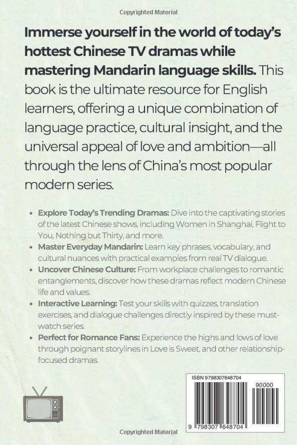 This book is the ultimate resource for English learners, offering a unique combination of language practice, cultural insight, and the universal appeal of love and ambition–all through the lens of China’s most popular modern series. Key features: Explore Today’s Trending Dramas: Features the newest Chinese dramas, giving you fresh language content Master Everyday Mandarin: Learn key phrases, and cultural nuances from real TV dialogue Uncover Chinese Culture: From workplace challenges to romantic entanglements, discover how these dramas reflect modern Chinese life and values Interactive Learning: Test your skills with quizzes directly inspired by these must-watch series Perfect for: A must-have for fans of romance, heartfelt storytelling, and cultural immersion Tailored for Mandarin learners at all levels to improve fluency naturally Anyone interested in learning Chinese while enjoying the best of Chinese entertainment