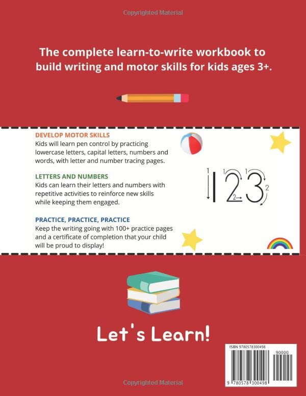 Learn to Write Workbook: Practice Line Tracing, Shapes, Letters, Numbers, Coloring and More! Children’s Activities Workbook, 120+ Pages Build communication skills with the ultimate writing workbook for kids ages 3+ This Handwriting workbook helps kids of all ages to start learning letters of the alphabet and to improve their handwriting. Purchase this Guided Fun Learn to Write Workbook to set up your kid for penmanship skills that will boost their success in school with a learn-to-write for kids guide that teaches them letters, shapes, numbers, words, colors and more. This Learn-to-Write Workbook introduces early writers to proper pen control, line tracing, and more with dozens of handwriting exercises that will keep them engaged and enhance their writing and reading comprehension. This handwriting activity book includes: 120+ Practice pages–Plenty of attention grabbing activities like line tracing and counting offer enough repetition for learning but enough variety to keep kids interested and excited to learn. Comprehensive skill-building–As they complete the exercises in this workbook, kids will develop a strong foundation of fine motor skills, reading comprehension, and penmanship. Coloring fun–This workbook is full of pictures and illustrations that will keep kids excited to keep practicing. Your child will develop the motor control for writing while also learning to recognize each letter. Get your little one on the path of knowledge with this interactive workbook that is designed to help them master early learning skills. This Letters & Numbers Workbook progressively builds confidence in learning to write including: Writing the Alphabet (A-Z, a-z) Line Tracing and Shapes Writing Numbers & Number Words Learning Colors Coloring Pictures and Illustrations Practice Pages to review Letters, Numbers & Number Words BONUS: Certificate of Completion Your child will learn writing using an easy dot-to-dot and directional arrow tracing method: Practice learning to write the alphabet and numbers. Interesting and attention-grabbing pictures for your child to color to keep them excited and engaged. Learn to write sight and number words. This Tracing Workbook will help kids get tons of much needed repetitive practice. This Workbook is organized in a skill building way to help your child learn to write neatly and legibly! This Handwriting workbook helps children of all ages to start learning letters of the alphabet and to improve their handwriting. Learn to trace both Uppercase letters and lowercase letters and practice writing on your own Buy today, to help your child take their first step confidently into the fun world of writing! Let’s Learn!