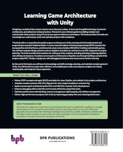 Description Designing a scalable Unity project requires more than just coding–it demands thoughtful planning, structured architecture, and adherence to best practices. This book is your ultimate guide to building modular and maintainable Unity projects using C# and proven game architecture techniques. This book provides the tools and knowledge you need to plan, build, and optimize projects with confidence. This book offers a comprehensive guide to game architecture in Unity, starting with the fundamentals and progressing to practical implementation. It covers essential object-oriented programming (OOP) concepts like encapsulation and inheritance, and delves into clean code principles (SOLID) for building maintainable games. You will learn popular design patterns such as singleton and observer, and how to use UML diagrams for project planning. The book provides best practices for setting up Unity projects, including selecting rendering pipelines and utilizing namespaces. It explores proven game architectures and guides you through building a sample Unity project using MVC. Finally, it equips you with debugging techniques and resources for further learning. By the end of this book, you will have the knowledge and skills to design, develop, and maintain complex games in Unity. You will be able to create clean, efficient, and scalable game code, ensuring your projects are robust, maintainable, and ready for future expansion. What you will learn * Master OOP concepts and apply SOLID principles for clean, flexible, and modular Unity project architecture. * Visualize complex systems with UML diagrams for clear project breakdown and planning. * Explore proven game architectures like MVC and MVCS for modular Unity development. * Enhance debugging skills to identify and fix issues efficiently using Unity tools. * Optimize performance with batching, memory management, lightmapping, and collision management. * Deliver high-performance projects with Unity by improving gameplay flow and reducing bottlenecks. Who this book is for This book is for beginner to mid-level Unity developers who want to upskill their capability to manage Unity projects from a scalability and flexibility point of view. Advanced users can also refine their approach and consolidate their existing knowledge into a cohesive, scalable architecture. Additionally, this book is highly valuable for team leads and senior developers who are responsible for laying the foundation for projects that junior developers will follow. Table of Contents 1. Introduction to Game Architecture 2. Revisiting Object-oriented Programming Concept 3. Design Principles for Clean Code 4. Essential Design Patterns 5. Unified Modeling Language Essential 6. Best Practices to Start a Unity Project 7. Proven Game Architecture to Use 8. Sample Unity Project using MVC: Part 1 9. Sample Unity Project using MVC: Part 2 10. Performance Testing and Optimization Strategies for Unity Projects 11. Where to Go Next