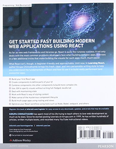 Learning React A hands-on guide to building maintainable, high-performing web application user interfaces using the React JavaScript library As far as new web frameworks and libraries go, React is quite the runaway success. It not only deals with the most common problems developers face when building complex apps, it throws in a few additional tricks that make building the visuals for such apps much, much easier. What React isn’t, though, is beginner-friendly and approachable. Until now. In Learning React, author Kirupa Chinnathambi brings his fresh, clear, and very personable writing style to help you understand the fundamentals of React and how to use it to build really performant (and awesome) apps. Build your first React app Create components to define parts of your UI Combine components into other components to build more complex UIs Use JSX to specify visuals without writing full-fledged JavaScript Deal with maintaining state Work with React’s way of styling content Make sense of the mysterious component lifecycle Build multi-page apps using routing and views Optimize your React workflow using tools such as Node, Babel, webpack, and others Contents at a Glance Chapter 1 Introducing React Chapter 2 Building Your First React App Chapter 3 Components in React Chapter 4 Styling in React Chapter 5 Creating Complex Components Chapter 6 Transferring Properties (Props) Chapter 7 Meet JSX-Again! Chapter 8 Dealing with State Chapter 9 Going from Data to UI Chapter 10 Working with Events Chapter 11 The Component Lifecycle Chapter 12 Accessing DOM Elements Chapter 13 Creating a Single-Page App Using React Router Chapter 14 Building a Todo List App Chapter 15 Setting Up Your React Development Environment Chapter 16 The End Chapter 17 (Web Edition) Working With External Data Chapter 18 (Web Edition) Creating a Sliding Menu Using React Motion Register your book at informit.com/register for free access to the Web Edition and two exclusive bonus chapters.