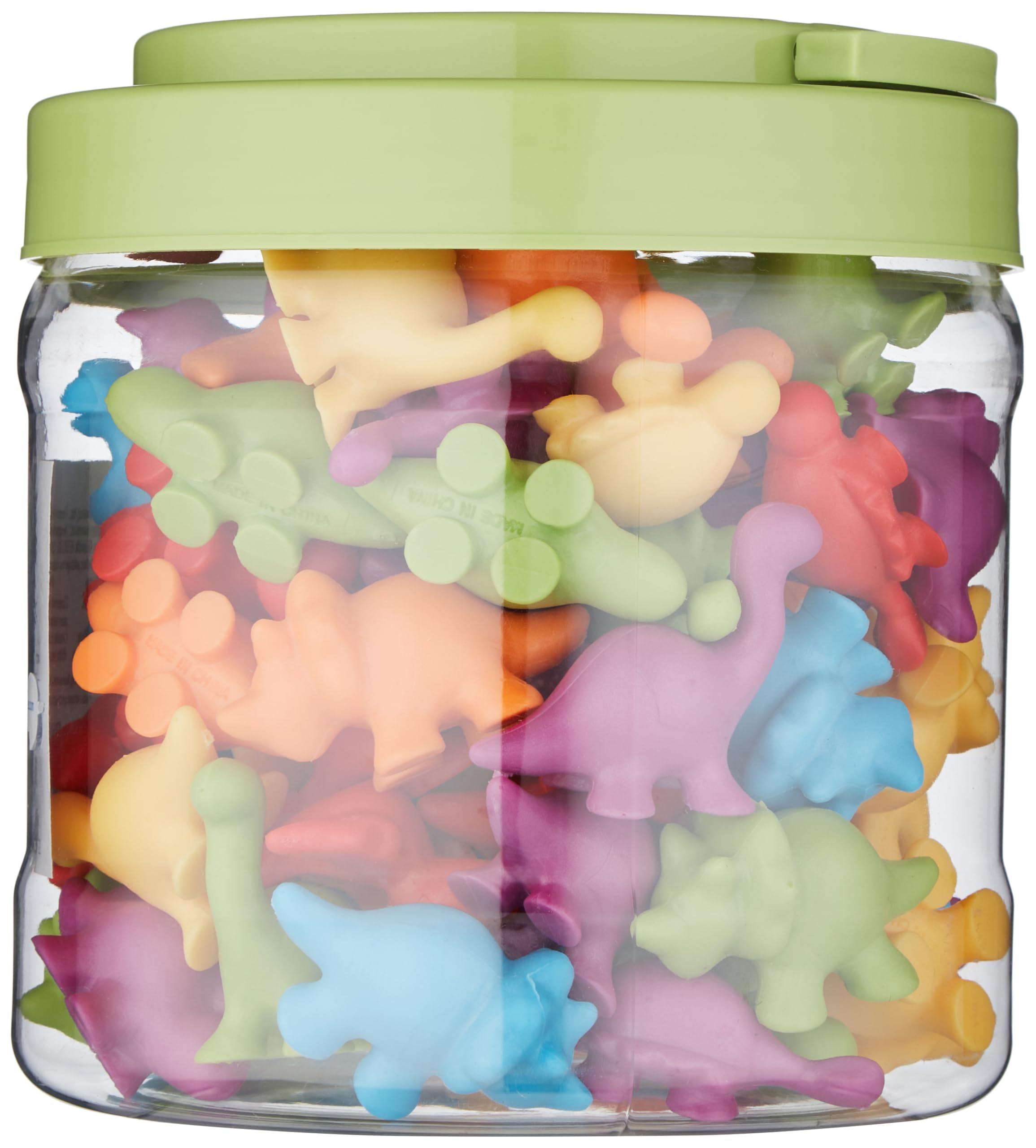 Go back in time to reinforce counting, sorting, patterning, and other early math skills! Set of 72 counters come in 6 different shapes and colors. Dinosaur figures include stegosaurus, brontosaurus, t-rex, triceratops, pterodactyl, and ankylosaurus. Includes storage bucket and Activity Guide. Tallest figure measures 1 1/2″H. Grades PreK+/Ages 3+. Set of 72.
