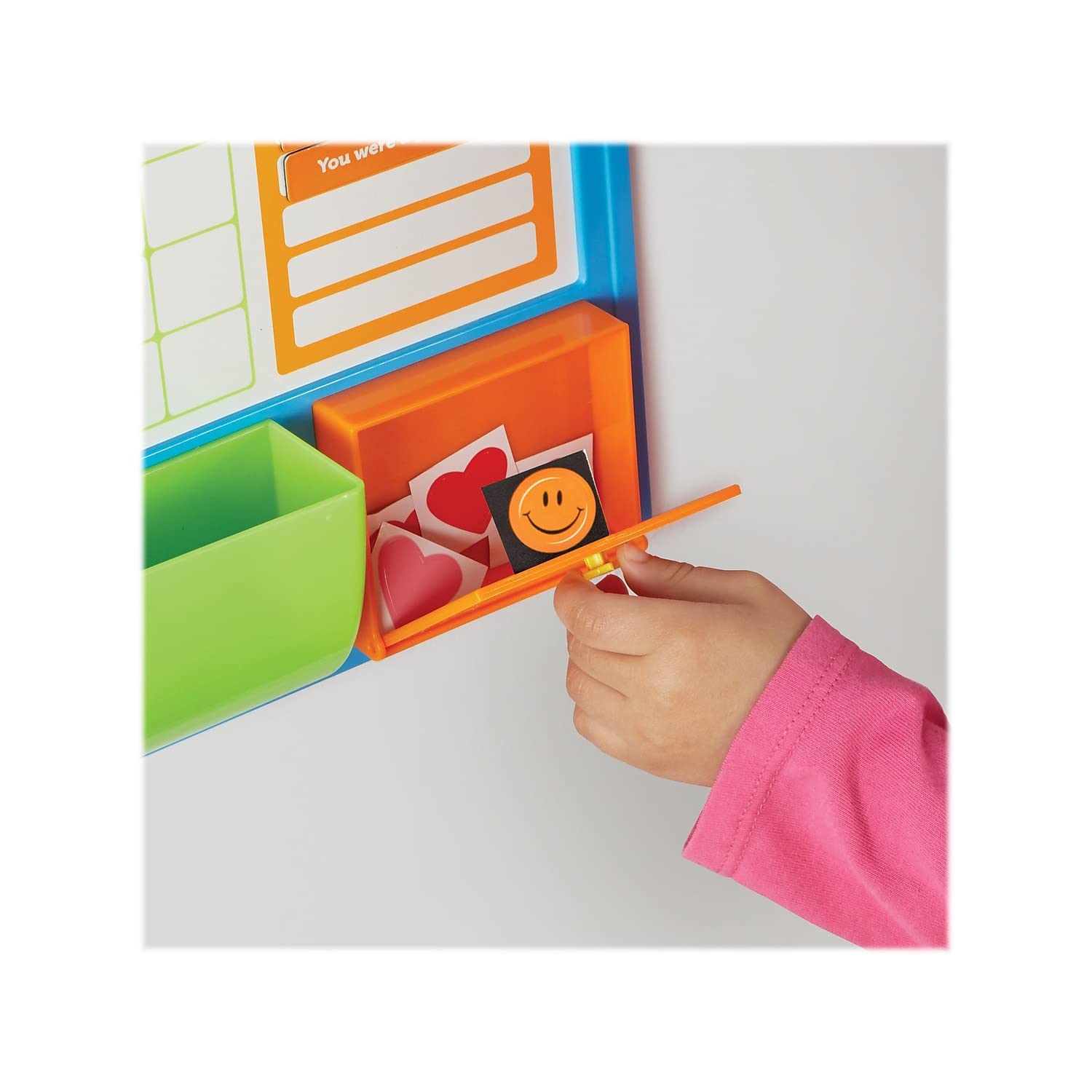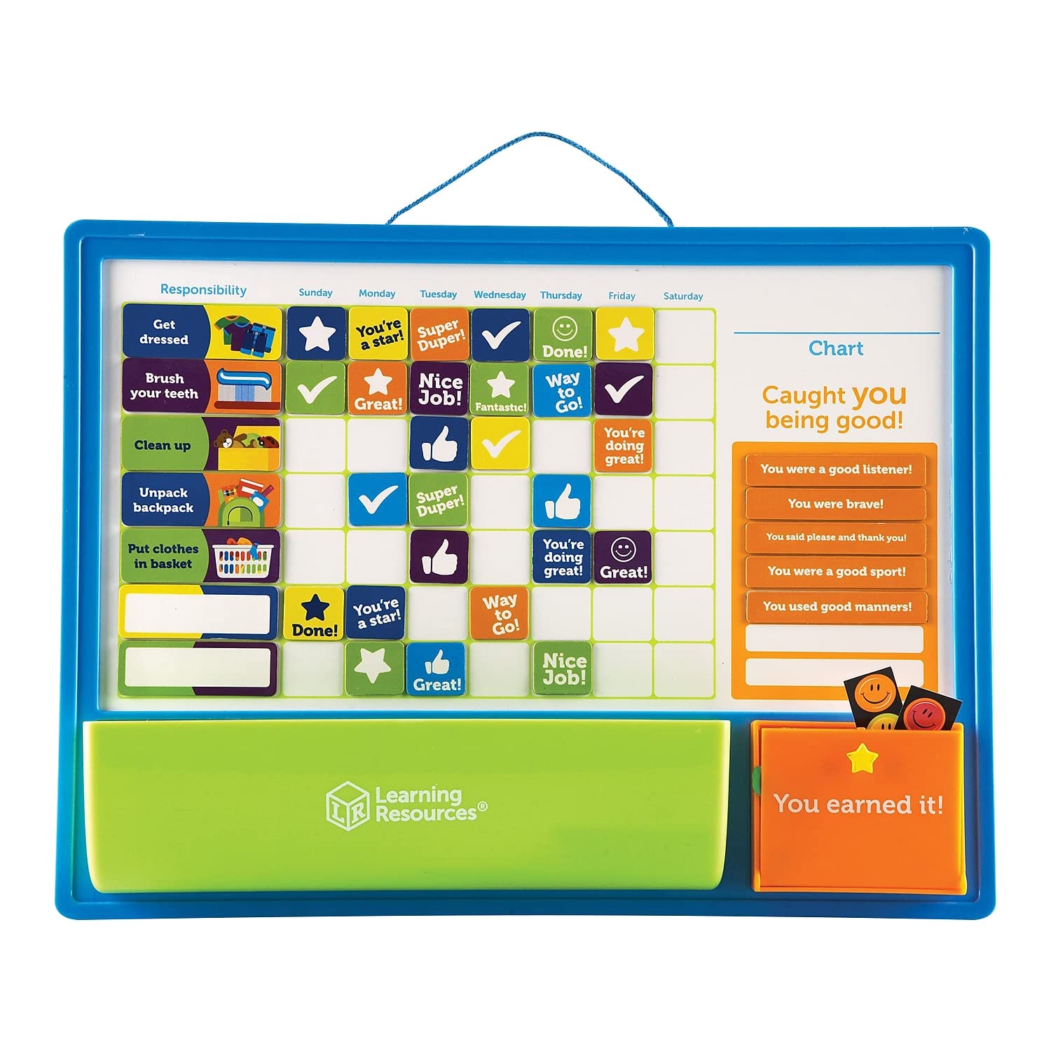 Now parents have the tools to help raise more responsible, self-reliant kids while supporting goal setting and good behavior. This magnetic responsibility chart encourages kids to develop, track, and earn rewards for their good behaviors with the good job reward chart from Learning Resources. This magnetic responsibility chart is durable and customizable with magnetic tiles and stickers corresponding to common household tasks, from “make the bed” and “help with dinner” to “do homework” and “brush your teeth.” Kids and parents may track daily progress when they choose a task (or customize one with blank stickers included). Parents may add an incentive and reward positive progress with accomplishment magnets, small toys and treats in the chart’s fun reward box. Kids may also earn their rewards through good behavior that’s unrelated to chores. The good behavior reward chart makes a great gift! The “caught you being good!” section gives parents space to recognize and celebrate moments of sweetness with magnets and stickers complete with affirmation-filled phrases.
