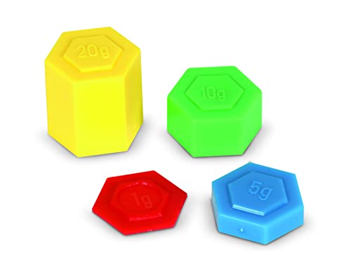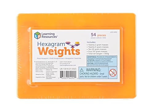 The Learning Resources Hexagram Metric Weight Set will engage little learners in a wide variety of measuring activities. These durable and accurate plastic hexagrams are color coded and can be used with any balance. The Learning Resources Hexagram Metric Weight Set – 54 Piece Features: 20 Each of 1 gram and 5 gram weights Ten 10 gram weights Four 20 gram weights Durable plastic construction Plastic storage box