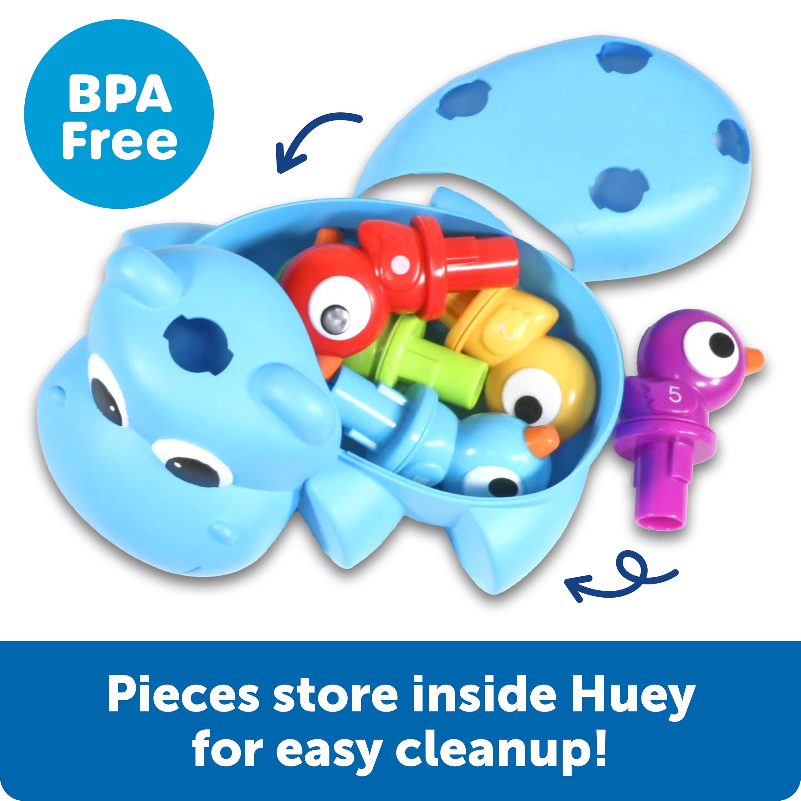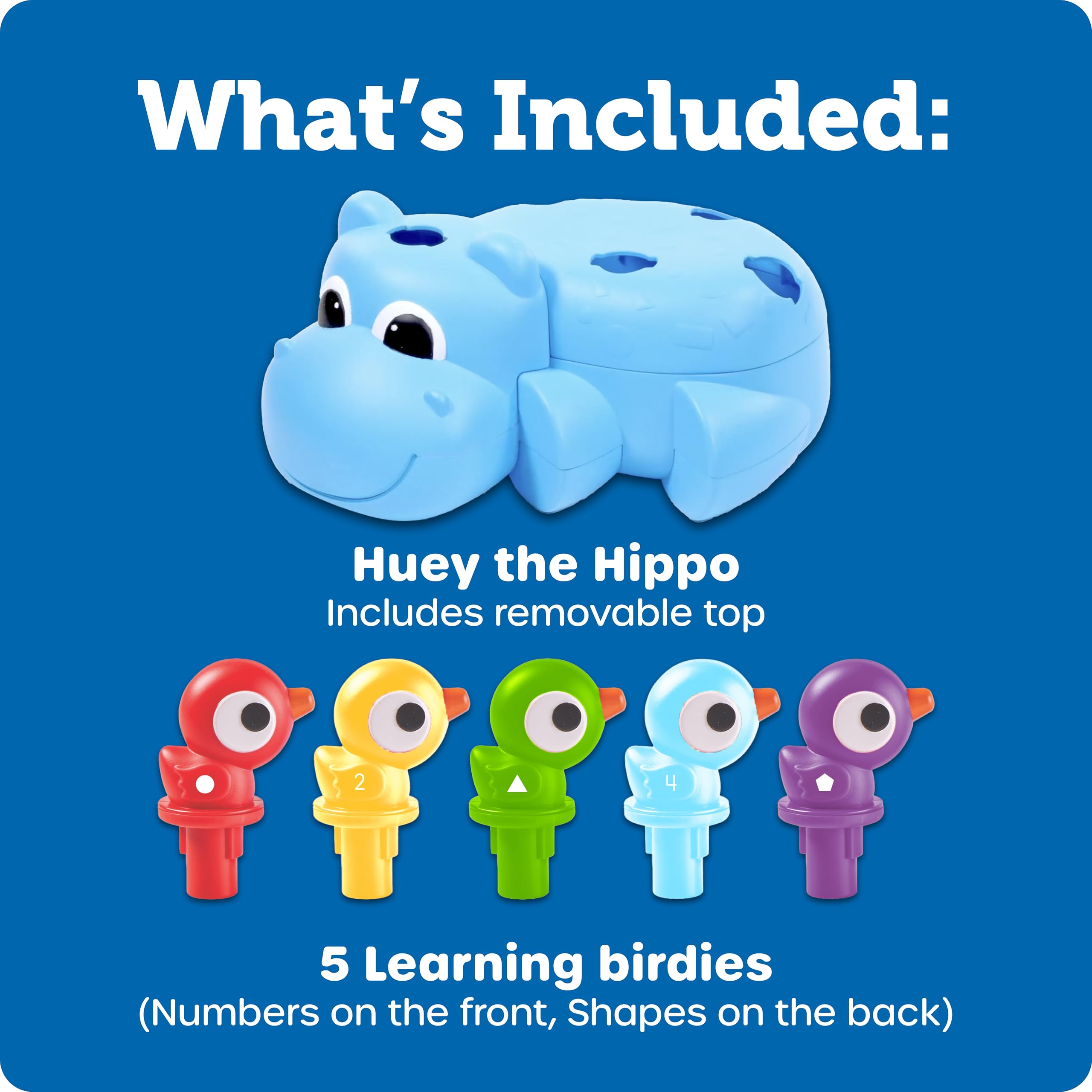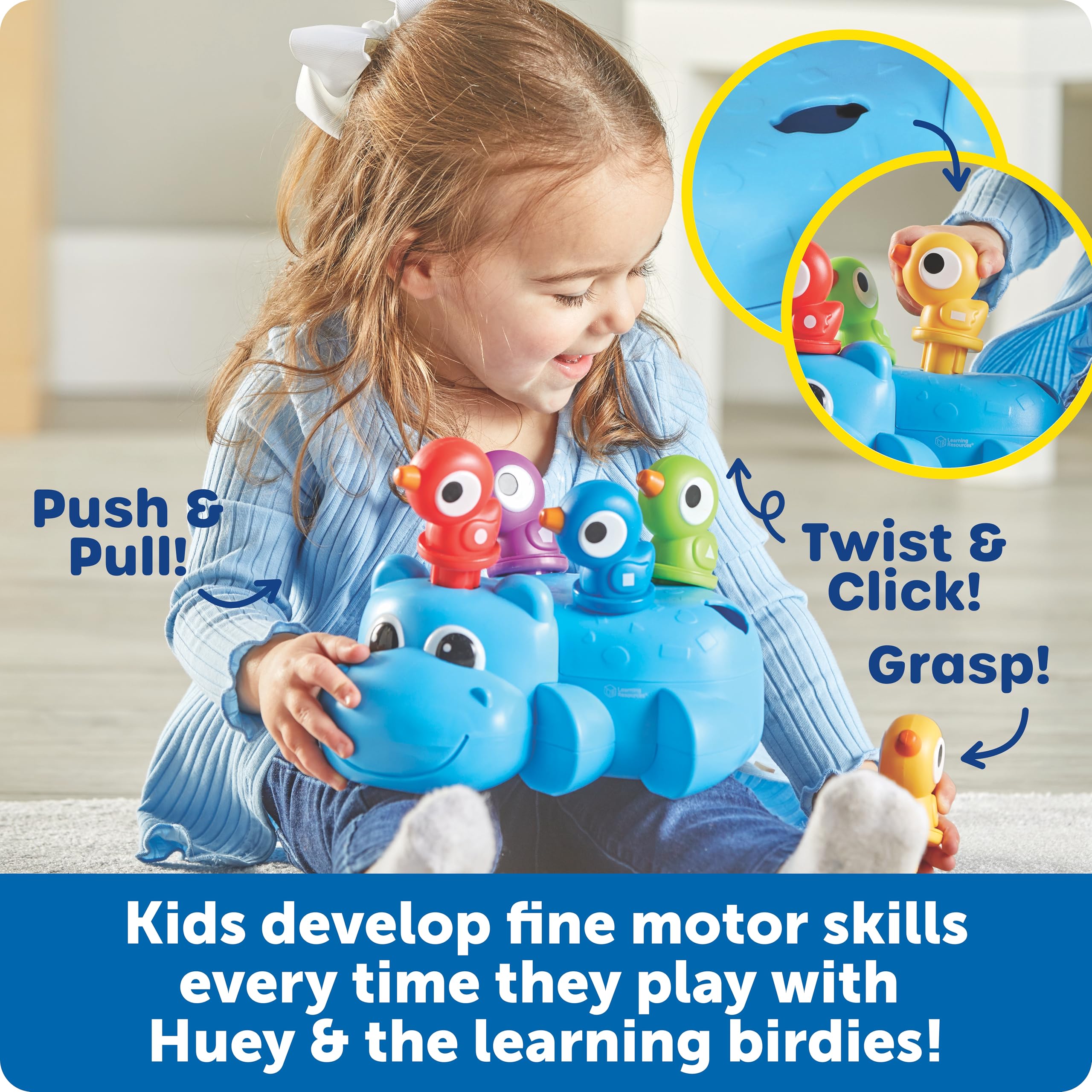 Huey and his birdie friends are ready for preschool fine motor fun! Whether they’re learning in preschool or through homeschooling, toddlers build the whole-hand twister grip they need to turn doorknobs and more every time they play with Huey the Fine Motor Hippo from Learning Resources! The friendliest fine motor toy for toddlers, this adorable hippo comes with 5 colorful birdies, whose twist-and-click action make it easy for toddlers to build their twister grasp, coordination, and other whole-hand essentials of preschool fine motor skills development. Huey’s birdies also come with a bonus learning surprise–in addition to building fine motor and gross motor skills, these preschool toys also introduce toddlers to preschool color, number, and shape identification skills thanks to their vibrant designs. Twist and click the birdies, sort them into warm and cool colors, and more–with Huey the Fine Motor Hippo, there are always multiple ways to learn. When the preschool fine motor fun is finished for the day, Huey’s durable plastic birdies wipe clean and fit inside for easy storage.