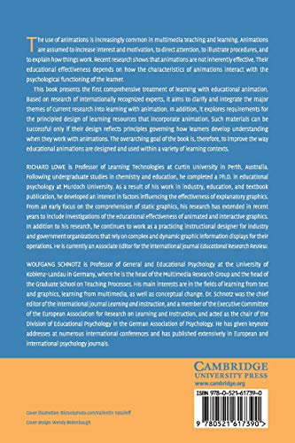 The use of animations has recently become common in multimedia teaching and learning. Animations are assumed to increase interest and motivation, direct attention, illustrate procedures, and explain how things work. Recent research shows that animations are not inherently effective. Their educational effectiveness depends on how the characteristics of animations interact with the psychological functioning of the learner. Clarifying and integrating the major themes of current research, this book explores requirements for the principled design of learning resources that incorporate animation. Such materials can only be successful if their design reflects principles governing how learners develop understandings with animations, and the goal of this book is to improve the way educational animations are designed and used within a variety of learning contexts.