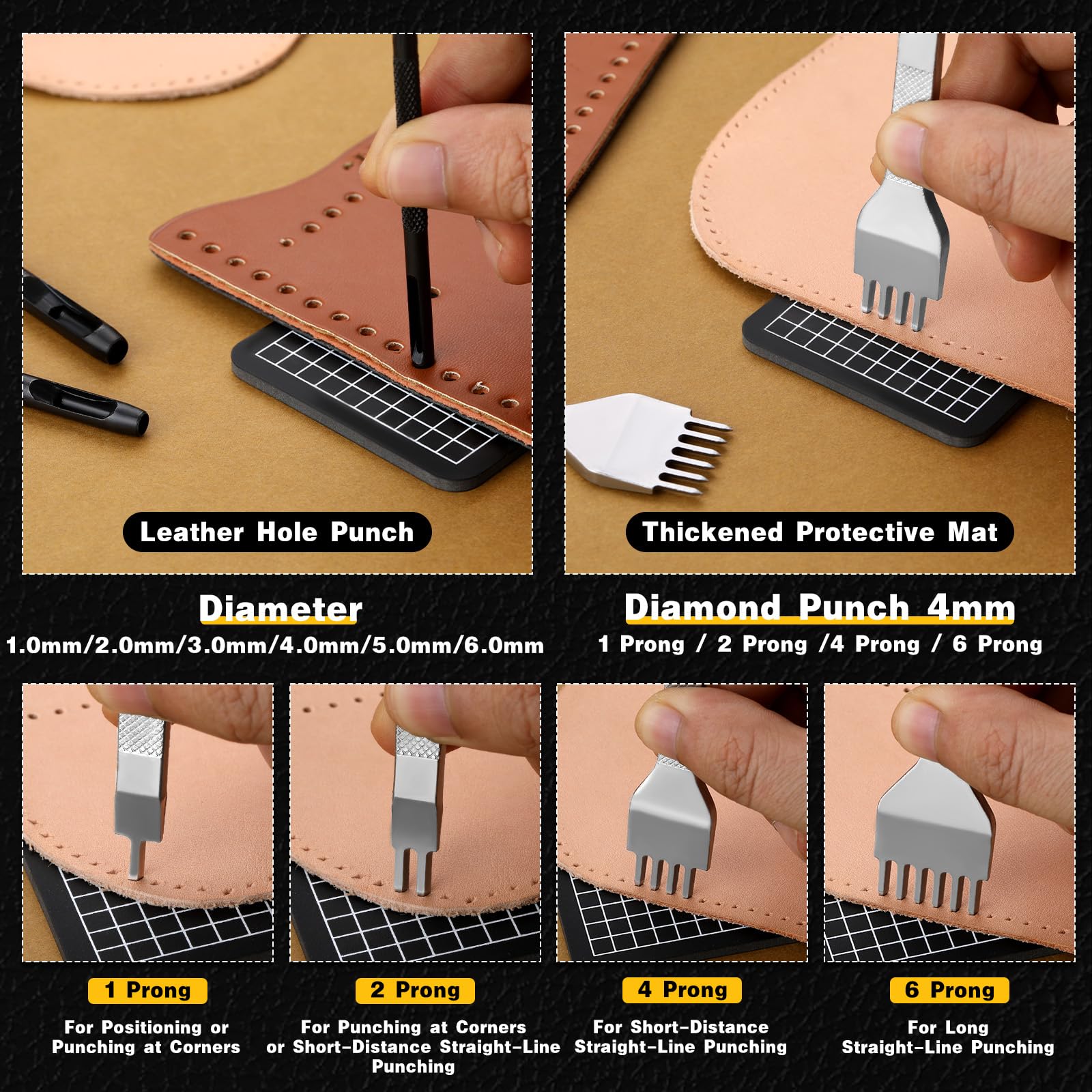 • EASY TO USE: These leather punching tools are ergonomically designed and can be easily operated by both beginners and experienced craftsmen. Place the punch on the fabric you need to punch holes in, with the Punch Pad underneath, and hit the punch with a hammer to complete the punching. Leather lacing stitching punches can punch diamond-shaped holes, which is suitable for punching holes before stitching. The round hole punches are especially suitable for punching belts, watch straps, purses, canvas, clothes, paper, etc.
