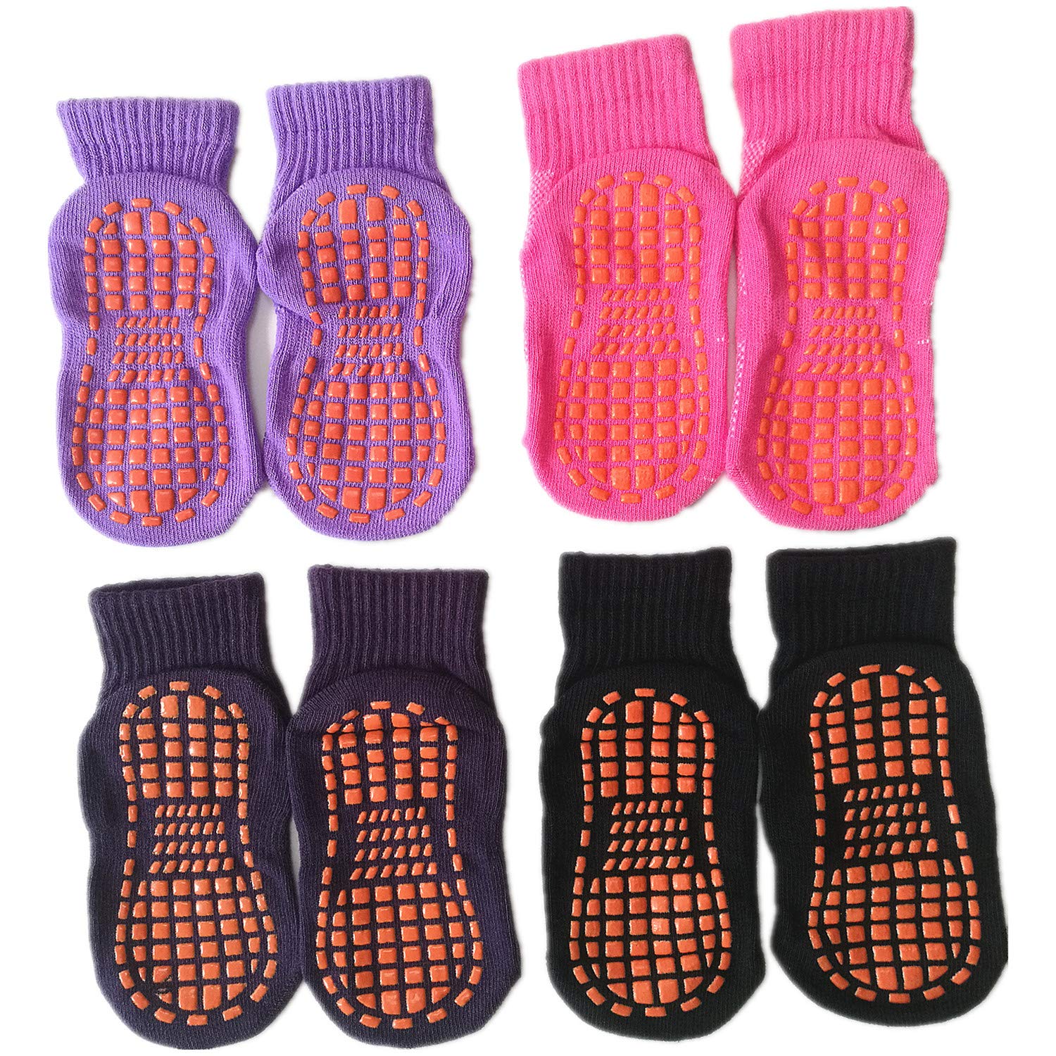 Description Our well selected Trampoline socks are also perfect for daily wear in house, kids likes to barefoot in house so an anti-slip socks will keep them more safety. Two Color Option: Boys: Black, Navy, Blue, Yellow Girls: Black, Dark Purple, Purple, Pink Two Size Options: 2-5years older or 6-9years old Wash Instruction: Suggested Hand Wash Only under 86 Fahrenheit Degree Water. Airdry. Do not Ironing. Package: 4 pairs in one polybag One order get 4pairs.