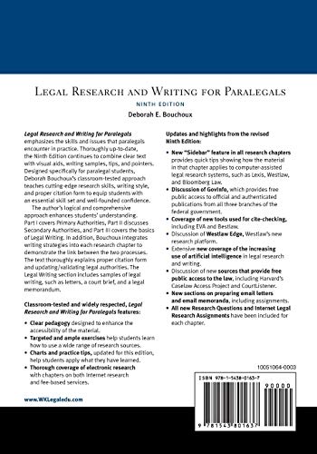 Legal Research and Writing for Paralegals emphasizes the skills and issues that paralegals encounter in practice. Thoroughly up-to-date, the Ninth Edition continues to combine clear text with visual aids, writing samples, tips, and pointers. Designed specifically for paralegal students, Deborah Bouchoux s classroom-tested approach teaches cutting-edge research skills, writing style, and proper citation form to equip students with an essential skill set and well-founded confidence. The author s logical and comprehensive approach enhances students understanding. Part I covers Primary Authorities, Part II discusses Secondary Authorities, and Part III covers the basics of Legal Writing. In addition, Bouchoux integrates writing strategies into each research chapter to demonstrate the link between the two processes. Thorough coverage of electronic research includes chapters on both internet research and fee-based services. Bouchoux thoroughly explains proper citation form and the process of updating/validating legal authorities. The Legal Writing section includes samples of legal writing, such as letters, a court brief, and a legal memorandum. New to the Ninth Edition: New Sidebar feature in all research chapters that provides quick tips showing how the material in that chapter applies to computer-assisted legal research systems, such as Lexis, Westlaw, and Bloomberg Law. Discussion of GovInfo, which provides free public access to official and authenticated publications from all three branches of the federal government. Coverage of new tools used for cite-checking, including EVA and Bestlaw. Discussion of Westlaw Edge, Westlaw s new research platform. Extensive new coverage of the increasing use of artificial intelligence in legal research and writing. Discussion of new sources that provide free public access to the law, including Harvard s Caselaw Access Project and CourtListener. New sections on preparing email letters and email memoranda, including assignments. All new Research Questions and Internet Legal Research Assignments have been included for each chapter. Professors and students will benefit from: Pedagogy designed to enhance the accessibility of the material, including helpful charts and diagrams that synthesize complex topics, Practice Tips offering realistic and helpful suggestions for workplace success, and Ethics Alerts in every chapter. Targeted and ample exercises help students learn how to use a wide range of research sources. Charts and practice tips, updated for this edition, that help students apply what they have learned. Tips on how to effectively use electronic resources are included throughout the text. Conscientious revision ensures that the book has the most up-to-date material, presented in a readable and accessible format.