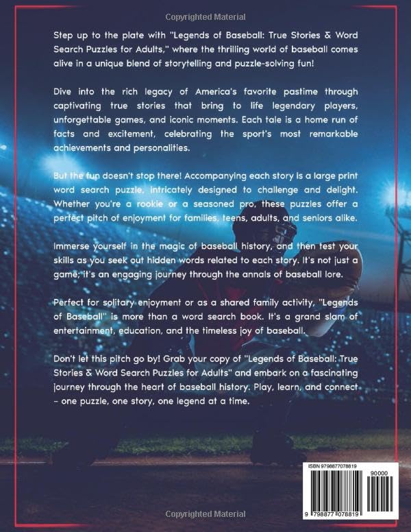 Experience the Magic of Baseball Like Never Before! Embark on an unforgettable journey through the annals of America’s pastime with “Legends of Baseball: True Stories & Word Search Puzzles for Adults.” This extraordinary book uniquely blends enthralling tales of baseball legends with the thrill of word search puzzles, offering an immersive experience for all baseball enthusiasts. Captivating Tales of Baseball’s Greatest Legends Delve into the best stories and incredible facts from the rich history of baseball. Relive Babe Ruth’s towering home runs, marvel at Cy Young’s pitching mastery, and feel the excitement of the Brooklyn Dodgers’ game-changing plays. From Willie Mays’ spectacular catches to the heroic underdog story of the 1969 Mets, this book brings to life the most inspirational and unforgettable tales from the great sport of baseball. Exhilarating Word Search Puzzles for Every Baseball Fan Each story is paired with a themed word search puzzle, carefully crafted in large print for an engaging and enjoyable challenge. Perfect for teens, adults, and seniors, these puzzles are not just fun but also a celebration of the sport’s greatest moments and figures. Designed for Accessibility and Enjoyment With large print, baseball-themed illustrations, and easy-to-find solutions, this book is accessible to puzzle enthusiasts of all ages and skill levels. It’s more than just a facts book for adults; it’s a journey through the heart of baseball history. The Perfect Gift for Every Baseball Lover “Legends of Baseball” is an ideal gift for anyone who cherishes baseball, from casual fans to die-hard enthusiasts. It’s a unique blend of a sports word search puzzle book and a captivating baseball trivia book, making it a must-have in every baseball lover’s collection. Don’t Miss Out on the Ultimate Baseball Adventure! Be a part of something amazing. Join the ranks of baseball’s most passionate fans and immerse yourself in the tales and puzzles of “Legends of Baseball: True Stories & Word Search Puzzles for Adults.” This isn’t just the best word search puzzle book out there; it’s a ticket to the greatest baseball stories ever told. Get your copy now and start your journey through baseball’s legendary past!