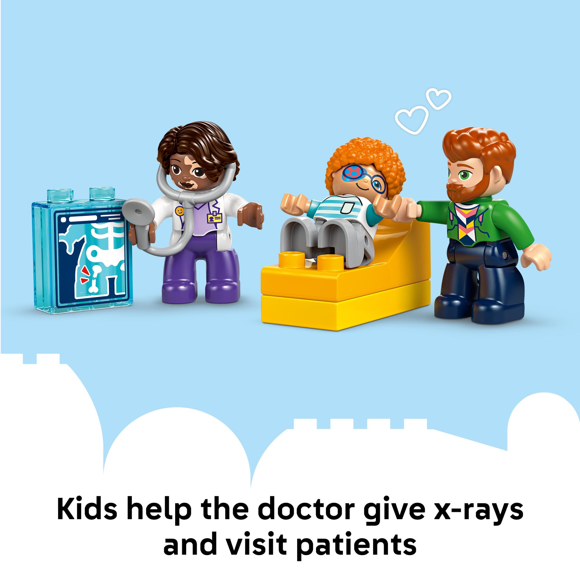 - DOCTORS TOY – Toddlers can explore feelings and play out different scenarios and routines with the LEGO DUPLO Town First Time: Visit with the Doctor Playset