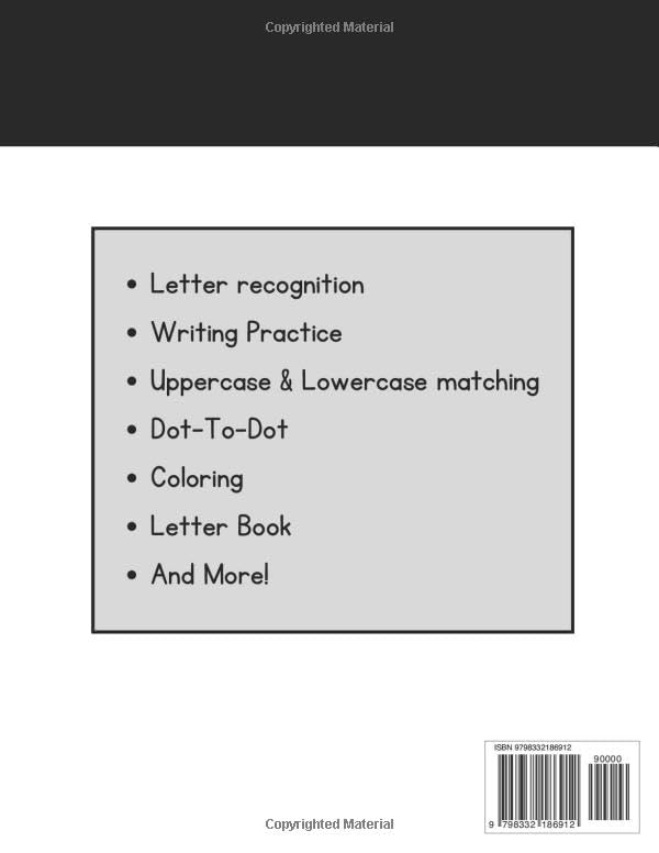 This workbook helps young learners develop letter recognition, phonetics, and fine motor skills through tracing and coloring activities.