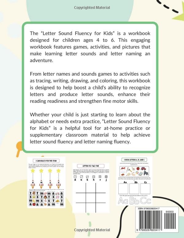The “Letter Sound Fluency for Kids” is a workbook designed for children ages 4 to 6. This engaging workbook features games, activities, and pictures that make learning letter sounds and letter naming an adventure. From letter names and sounds games to activities such as tracing, writing, drawing, and coloring, this workbook is designed to help boost a child’s ability to recognize letters and produce letter sounds, enhance their reading readiness and strengthen fine motor skills. Whether your child is just starting to learn about the alphabet or needs extra practice, “Letter Sound Fluency for Kids” is a helpful tool for at-home practice or supplementary classroom material to help achieve letter sound fluency and letter naming fluency.