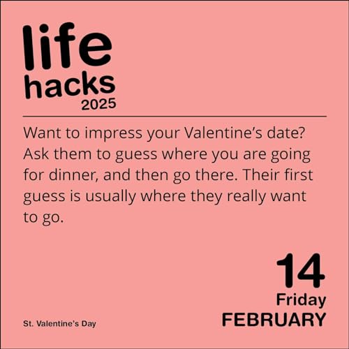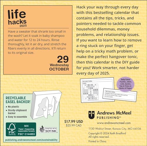 Problem-solving life hacks to the rescue! Covering all aspects of daily life, including finances, technology, relationships, wellness–even cooking, Keith Bradford’s Life Hacks 2025 Day-to-Day Calendar will hack your life for you one day at a time. Features include: No single-use plastic Recyclable chipboard easel backer for desk or tabletop display Page size: 4.606″ x 4.606″ Easel backer for desk or tabletop display Printed on FSC certified paper with soy-based ink Full-color tear-off pages Back of pages contain Daily Extra content such as puzzles, jokes, quotations Day/Date reference on each page Combined weekend pages Official major world holidays and observances Every page features a practical time- , money- , or trouble-saving tip