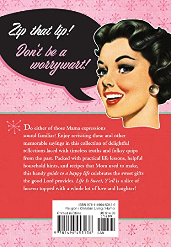 “Zip that lip!” “Don’t be a worrywart!” Do either of those Mama expressions sound familiar? Life Is Sweet, Y’all is a collection of delightful reflections laced with timeless truths and folksy quips from the past that celebrate the sweet gifts the good Lord provides. Packed with plenty of practical life lessons, helpful household hints, and recipes that Mama used to make, this handy guide to a happy life makes a great gift for any woman who longs for yesteryear. Consider it a slice of heaven topped with a whole lot of love and laughter.