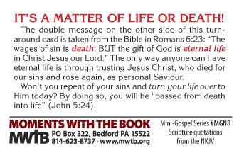 THE WAGES OF SIN IS DEATH THE GIFT OF GOD IS ETERNAL LIFE IT’S A MATTER OF LIFE OR DEATH! The double message on the other side of this turn-around card is taken from the Bible in Romans 6:23: “The wages of sin is death; BUT the gift of God is eternal life through Jesus Christ our Lord.” The only way anyone can have eternal life is through trusting Jesus Christ, who died for our sins and rose again, as personal Saviour. Won’t you repent of your sins and turn your life over to Him today? By doing so, you will be “passed from death unto life” (John 5:24).