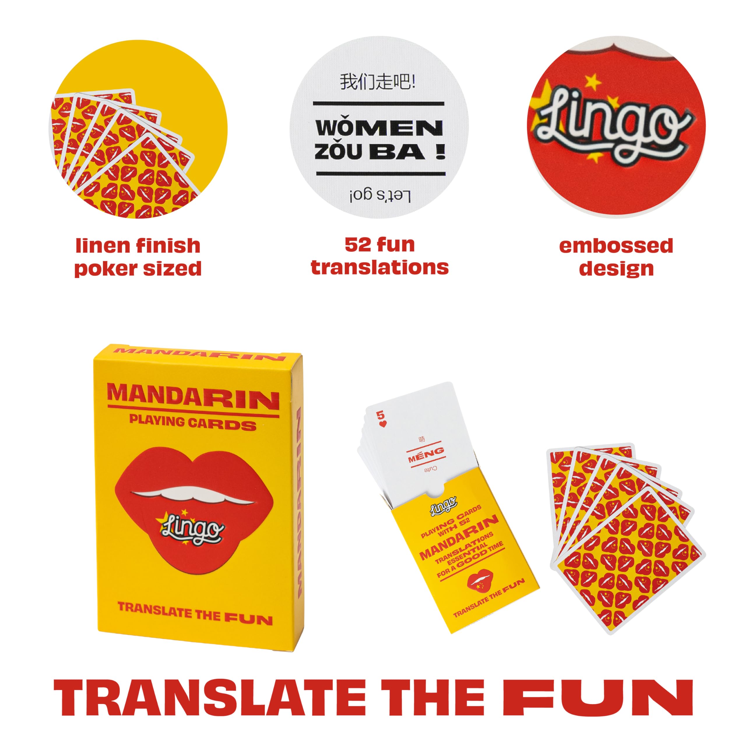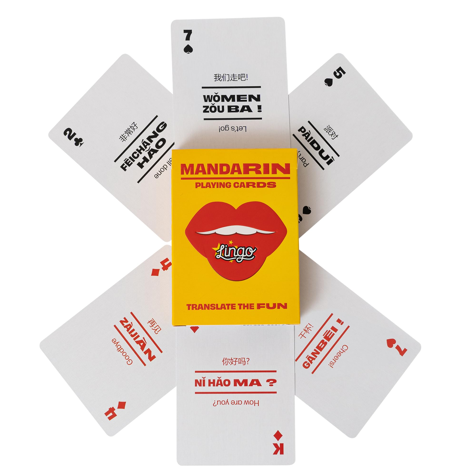 - EXPLORE AND PLAY ENDLESS -Add a touch of class and a dash of bilingual fun to your next game night. You can now learn cool Mandarin phrases and play your favorite card games like Poker, Black Jack, Spoons, Rummy, Go Fish, Memory, Crazy Eights, Hearts and Solitaire. Trust us, with these cards in your hand, you’ll be the one everyone’s talking about. Order your Lingo Playing Cards today and get ready for the most fun and exciting game night yet!