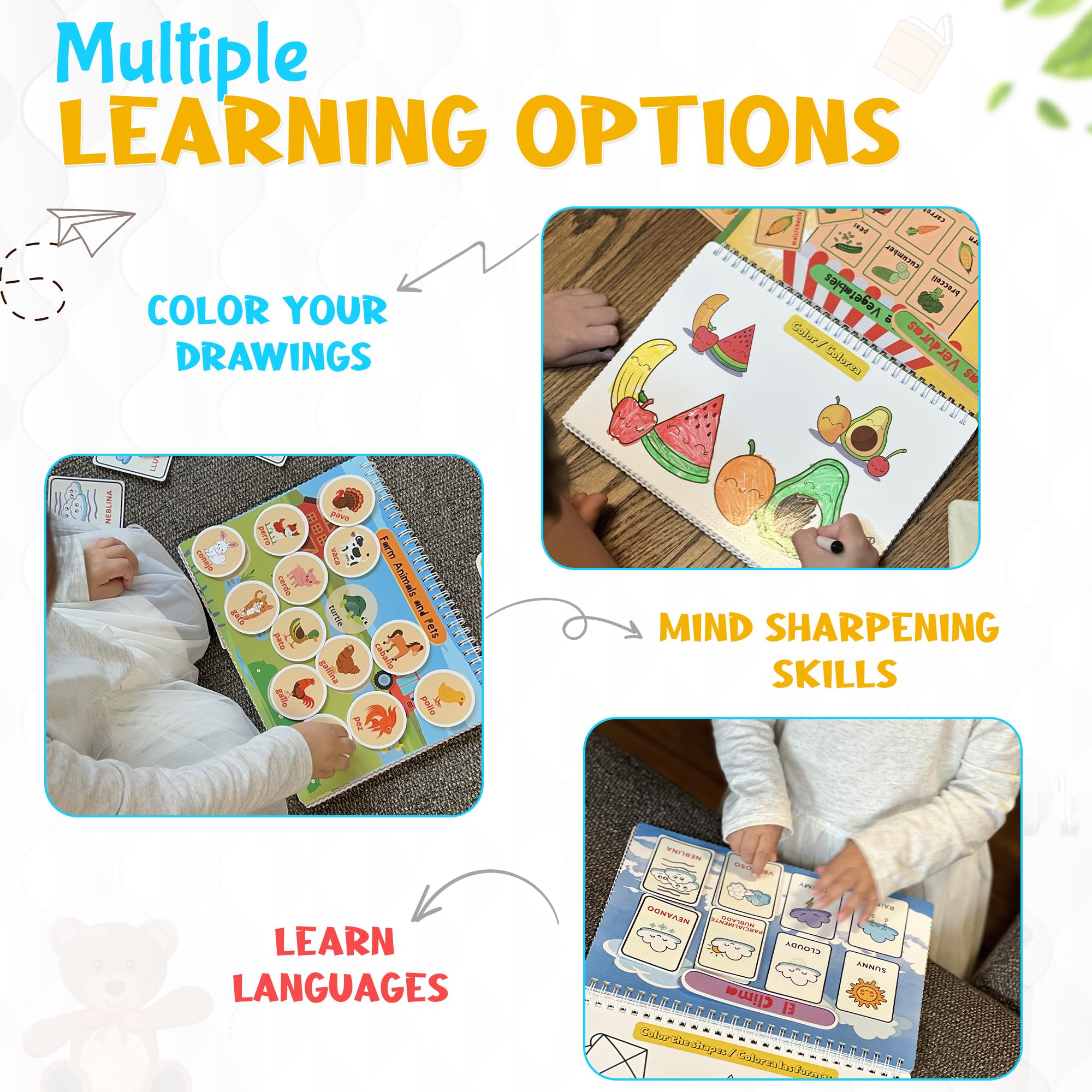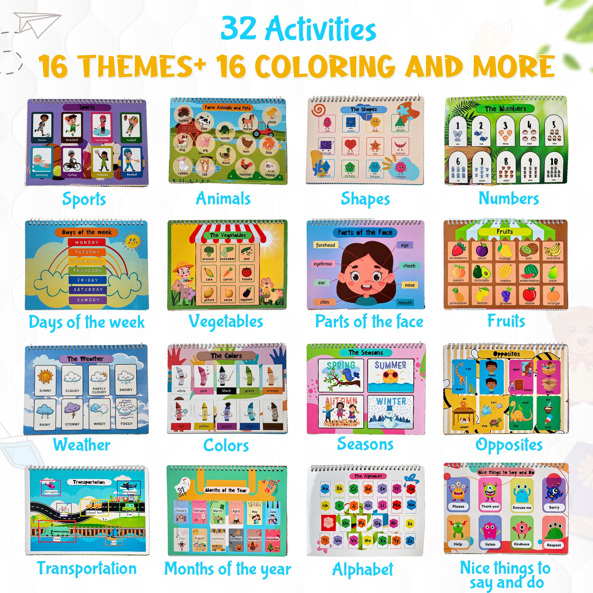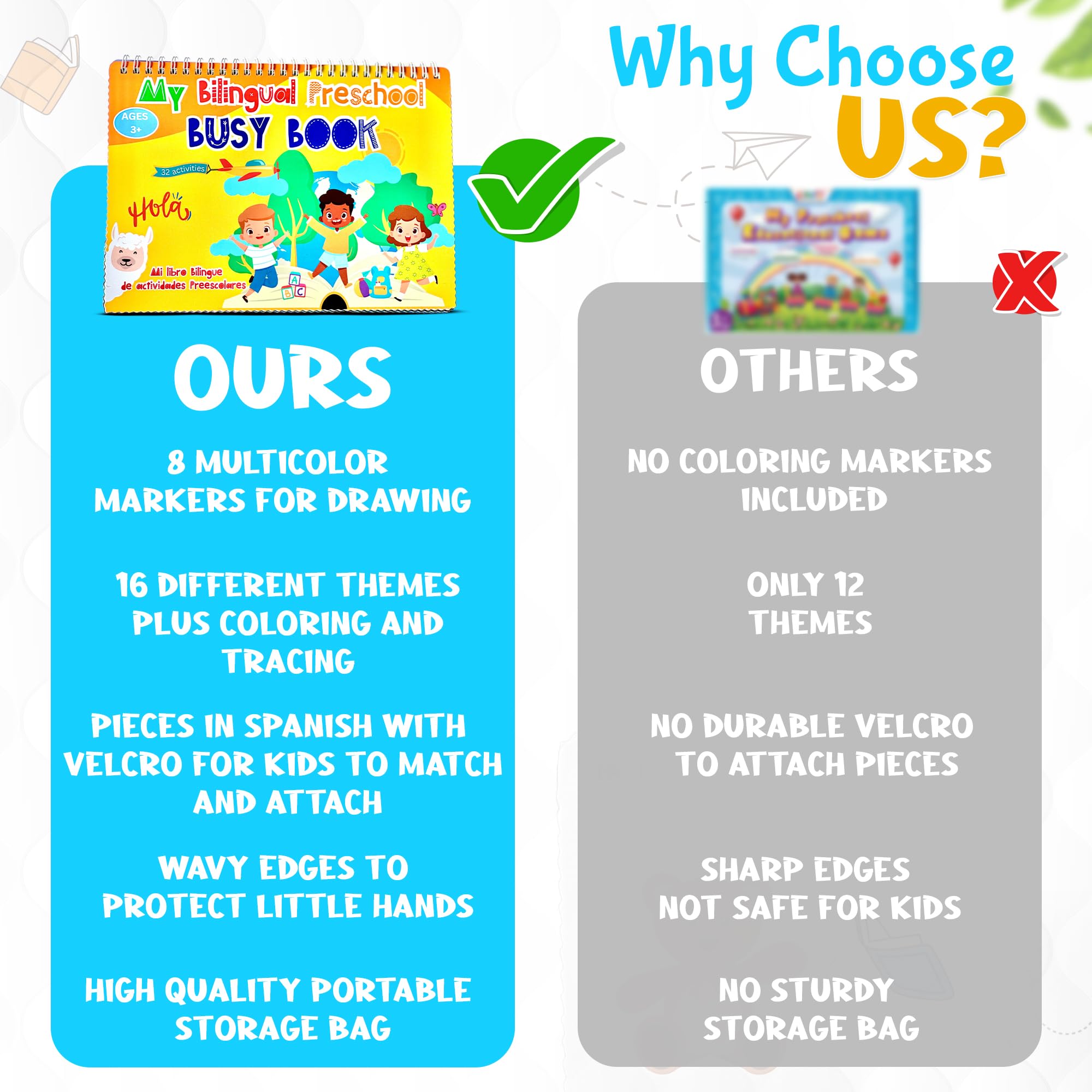 - Endless Learning Opportunities: Our Bilingual preschool learning book features 32 different activities with 16 main themes and 16 coloring and tracing activities, keeping kids entertained and promoting essential skills such as logical thinking, problem solving, fine motor skills, concentration, and bilingualism in a screen-free, interactive manner!
