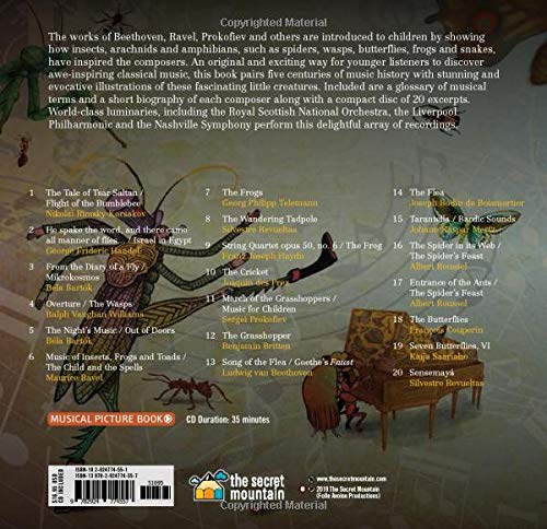 Catch the classical music bug with this critter-filled guide featuring 20 popular compositions. Introduce children to insects, arachnids, and amphibians, such as spiders, wasps, butterflies, frogs, and snakes through the works of Beethoven, Ravel, Prokofiev, and other composers An original and exciting way for younger listeners to discover classical music, this book pairs five centuries of music history with stunning and evocative illustrations of these fascinating little creatures. A glossary of musical terms and a short biography of each composer are included along with a CD (and a unique digital download code) of 20 compositions performed by world-renowned ensembles such as the Royal Scottish National Orchestra, Liverpool Philharmonic, and Nashville Symphony. WINNER OF THE PARENTS’ CHOICE SILVER AWARD