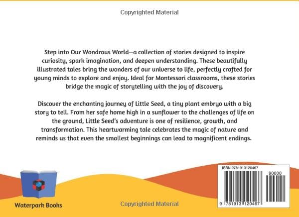 Step into Our Wondrous World–a collection of stories designed to inspire curiosity, spark imagination, and deepen understanding. These beautifully illustrated tales bring the wonders of our universe to life, perfectly crafted for young minds to explore and enjoy. Ideal for Montessori classrooms, these stories bridge the magic of storytelling with the joy of discovery. Discover the enchanting journey of Little Seed, a tiny plant embryo with a big story to tell. From her safe home high in a sunflower to the challenges of life on the ground, Little Seed’s adventure is one of resilience, growth, and transformation. This heartwarming tale celebrates the magic of nature and reminds us that even the smallest beginnings can lead to magnificent endings.