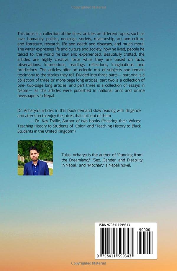 This book is a collection of the finest articles on different topics, such as love, humanity, politics, nostalgia, society, relationship, art and culture and literature, research, life and death and diseases, and much more. The writer expresses life and culture and society, how he lived, people he talked to, the world he saw and experienced. Beautifully crafted, the articles are highly creative force while they are based on facts, observations, impressions, readings, reflections, imaginations, and predictions. The articles offer an eclectic mix of subjects and remain testimony to the stories they tell. Divided into three parts– part one is a collection of three or more-page long articles; part two is a collection of one- two-page long articles; and part three is a collection of articles in Nepali– all the articles were published in national print and online newspapers in Nepal. Contents Turning the Focus on Students.. 6 Translating Nepali Literature in English.. 10 Discourse on Sex in Nepal. 16 Emerging Nepali Writers in English.. 23 Sex Among Older People.. 28 Embrace Ethical Leadership.. 36 The Nepali Literary Environment. 40 Education System In Need Of Change.. 45 Breaking Indoctrination Culture.. 48 Can a Man Cry?.. 52 Nothing Feels Like Home.. 56 Message from Political cartoons.. 59 Open The Window for Opportunity.. 63 Enlightened life.. 67 Comparing Cultures That Belittle Women.. 71 Living By Memories.. 75 Accept the Criticisms.. 79 Back To Village: Away from City Cacophony.. 82 Politics of Impression.. 88 Cultural Understanding of Gender to Assess the Cases of Sex and Rape.. 92 How Culture Shapes Politics.. 97 Let the Subaltern Speak.. 101 Nepali Literature and its Promising Future.. 105 Research Matters to Development. 110 Dealing with the Death.. 114 Drawing a parallel between Bhupi and Whitman.. 122 Magic of Music.. 125 Love Animals.. 127 Of Teachers and Tetchy Tykes.. 129 Bitter Truth.. 131 Brother and Sister. 133 Culture Vulture.. 135 Duty and Beauty.. 137 The English Teacher. 139 Refreshing the Mood.. 141 Sarangi. 143 Tears of Joy.. 145