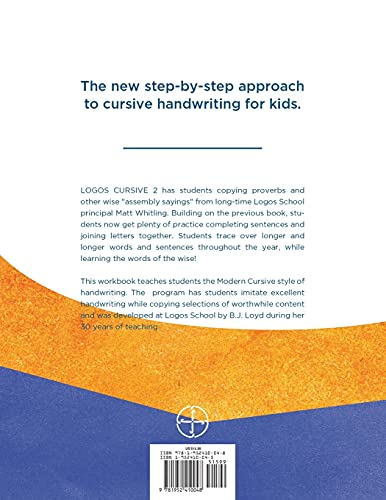 This workbook teaches students the Modern Cursive style of handwriting. The Logos Cursive program has students imitate step-by-step handwriting while copying selections of worthwhile content. B.J. Loyd developed it in the classroom during her 30+ years of teaching at Logos School. This workbook teaches students the Modern Cursive style of handwriting. This program has students imitate excellent handwriting while copying selections of worthwhile content and was developed in the 2nd grade classroom at Logos School by veteran teacher B.J. Jordan. Logos Cursive 2 has students copying proverbs and other wise “assembly sayings” from long-time Logos School principal Matt Whitling. Building on the previous books, students now get plenty of practice completing sentences and joining letters together. Students trace over longer and longer words and sentences throughout the year, while learning the words of the wise! Appropriate for students in the 2nd grade and up. It includes 71 exercises.