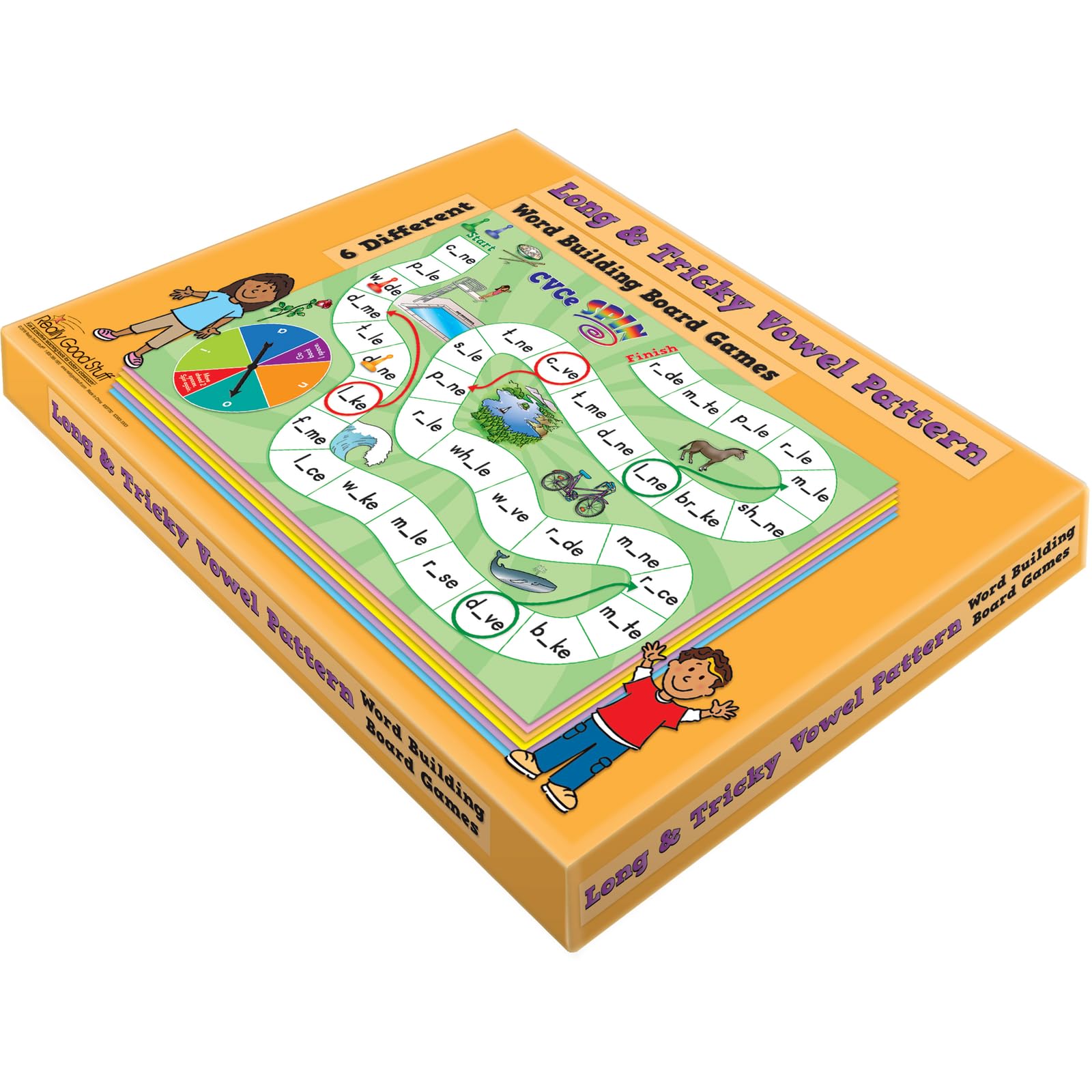 Bring excitement and fun into your learning environment with the Short Vowel Word Building Board Game from Really Good Stuff. Whether you are in a classroom or learning at home, this fun and exciting word game is ideal for students in grades K-2. This activity is also aligned with Common Core and state standards, so you can feel good knowing it is designed to work with your curriculum. The Vowel Pattern Word Building Board Game targets beginning and ending consonants and short vowels in CVC, CVCC, and CCVC words. Players move along a path building short vowel words by combining word parts from the built-in spinner and the ones on the game board. There are slides and ladders throughout that keep the game extra exciting and help keep kids engaged. This learning game for kids includes 6 heavy-duty game boards with built-in spinners, 12 game pawns, 1 storage box and 1 Really Good instructional guide.
