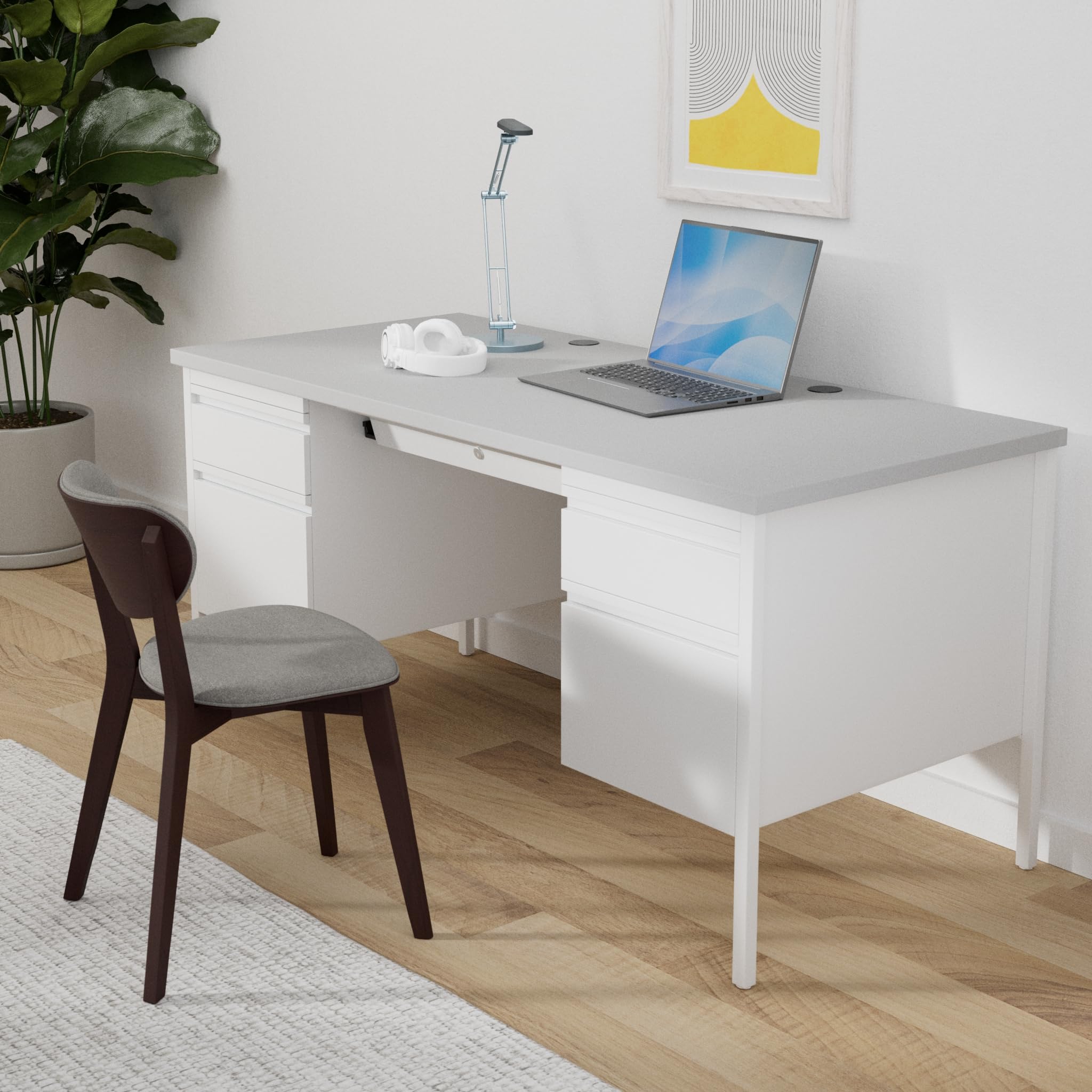 Gray double-pedestal desk is a practical, professional desk solution for business, government and educational offices. Durable, high-performance construction stands up to rigorous daily use. Desk features box/file pedestals with full-extension, ball-bearing slides, locking center drawer and integrated drawer pulls. Desk meets or exceeds ANSI/BIFMA standards.