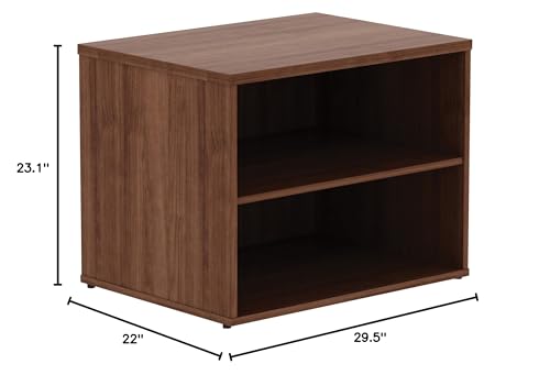 File cabinet credenza without doors is part of the Lorell Relevance Series, versatile and stylish office furniture that configures to meet your needs. Walnut laminate exterior matches other units in the series for a cohesive, professional look. Low cabinet provides two open shelves for flexible storage. Adjustable leveling feet help keep the credenza even on uneven surfaces.