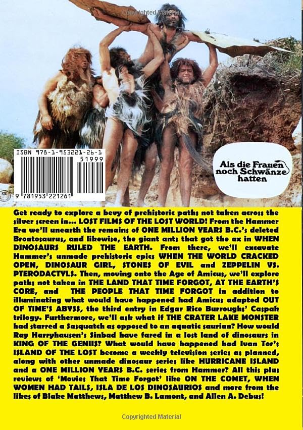 Get ready to explore a bevy of prehistoric paths not taken across the silver screen in… LOST FILMS OF THE LOST WORLD! From the Hammer Era we’ll unearth the remains of ONE MILLION YEARS B.C.’s deleted Brontosaurus, and likewise, the giant ants that got the ax in WHEN DINOSAURS RULED THE EARTH. From there, we’ll excavate Hammer’s unmade prehistoric epics WHEN THE WORLD CRACKED OPEN, DINOSAUR GIRL, STONES OF EVIL and ZEPPELIN VS. PTERODACTYLS. Then, moving onto the Age of Amicus, we’ll explore paths not taken in THE LAND THAT TIME FORGOT, AT THE EARTH’S CORE, and THE PEOPLE THAT TIME FORGOT in addition to illuminating what would have happened had Amicus adapted OUT OF TIME’S ABYSS, the third entry in Edgar Rice Burroughs’ Caspak trilogy. Furthermore, we’ll ask what if THE CRATER LAKE MONSTER had starred a Sasquatch as opposed to an aquatic saurian? How would Ray Harryhausen’s Sinbad have fared in a lost land of dinosaurs in KING OF THE GENIIS? What would have happened had Ivan Tor’s ISLAND OF THE LOST become a weekly television series as planned, along with other unmade dinosaur series like HURRICANE ISLAND and a ONE MILLION YEARS B.C. series from Hammer? All this plus reviews of ‘Movies That Time Forgot’ like ON THE COMET, WHEN WOMEN HAD TAILS, ISLA DE LOS DINOSAURIOS and more from the likes of Blake Matthews, Matthew B. Lamont, and Allen A. Debus!
