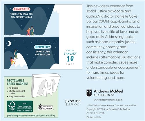 Be inspired to live a life of love and do good daily with this practical and uplifting new day-to-day calendar from @OhHappyDani. From social justice advocate and author/illustrator Danielle Coke Balfour comes a daily desk calendar full of inspiration, encouragement, and practical ideas to help good people become better neighbors and make a positive difference in their communities. Featuring illustrated ideas and affirmations, each page of this calendar is designed to motivate and inspire. Features include: Page size: 5.354″ x 4.488″ No single-use plastic Recyclable chipboard easel backer for desk or tabletop display Printed on FSC certified paper with soy-based ink Full-color tear-off pages Back of pages are blank for notes or lists Day/Date reference on each page Combined weekend pages Official major world holidays and observances Inspirational quotes, ideas, and illustrations from social justice advocate Danielle Coke Balfour (@OhHappyDani)