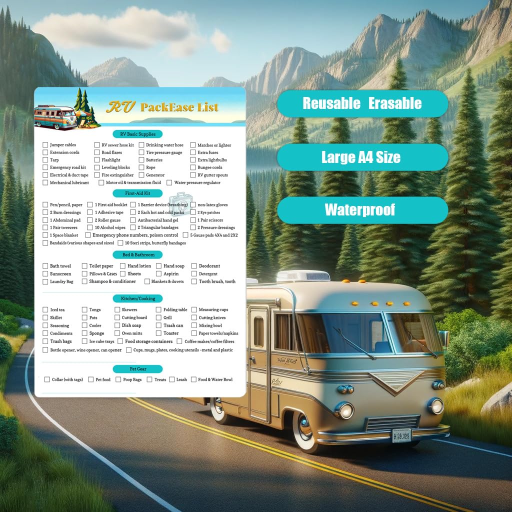 - Reusable Design: Featuring an A4-sized 8.27″ X 11.69″ , wipe-clean material, this RV Packing List is designed for repeated use, offering cost-effective solution for all RV travel enthusiasts.